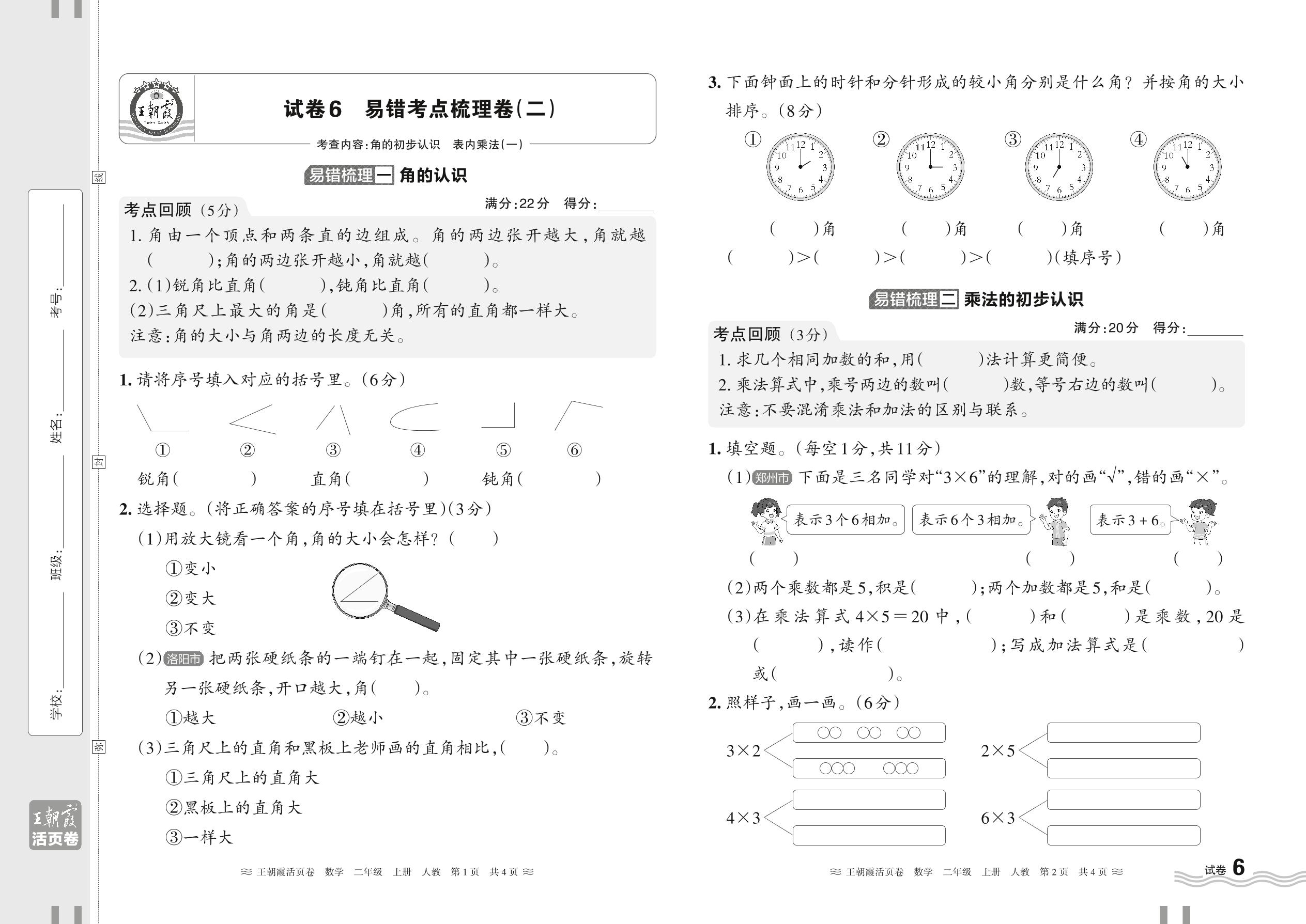 2024秋上册二年级数学人教版 易错考点处理卷:角的初步认识、表内乘法(一)【6】
