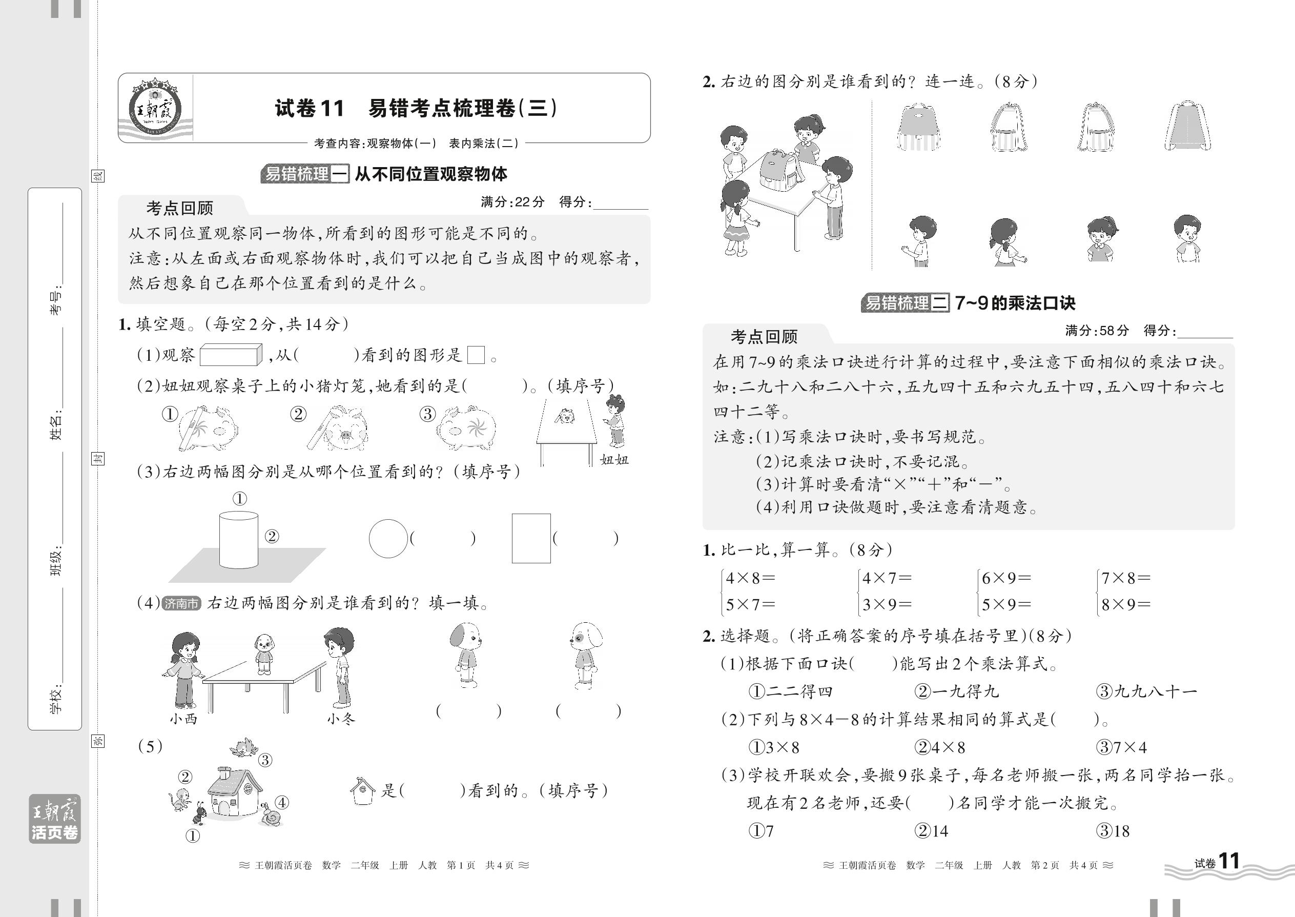 2024秋上册二年级数学人教版 易错考点梳理卷:观察物体(一)、表内乘法(二)【11】