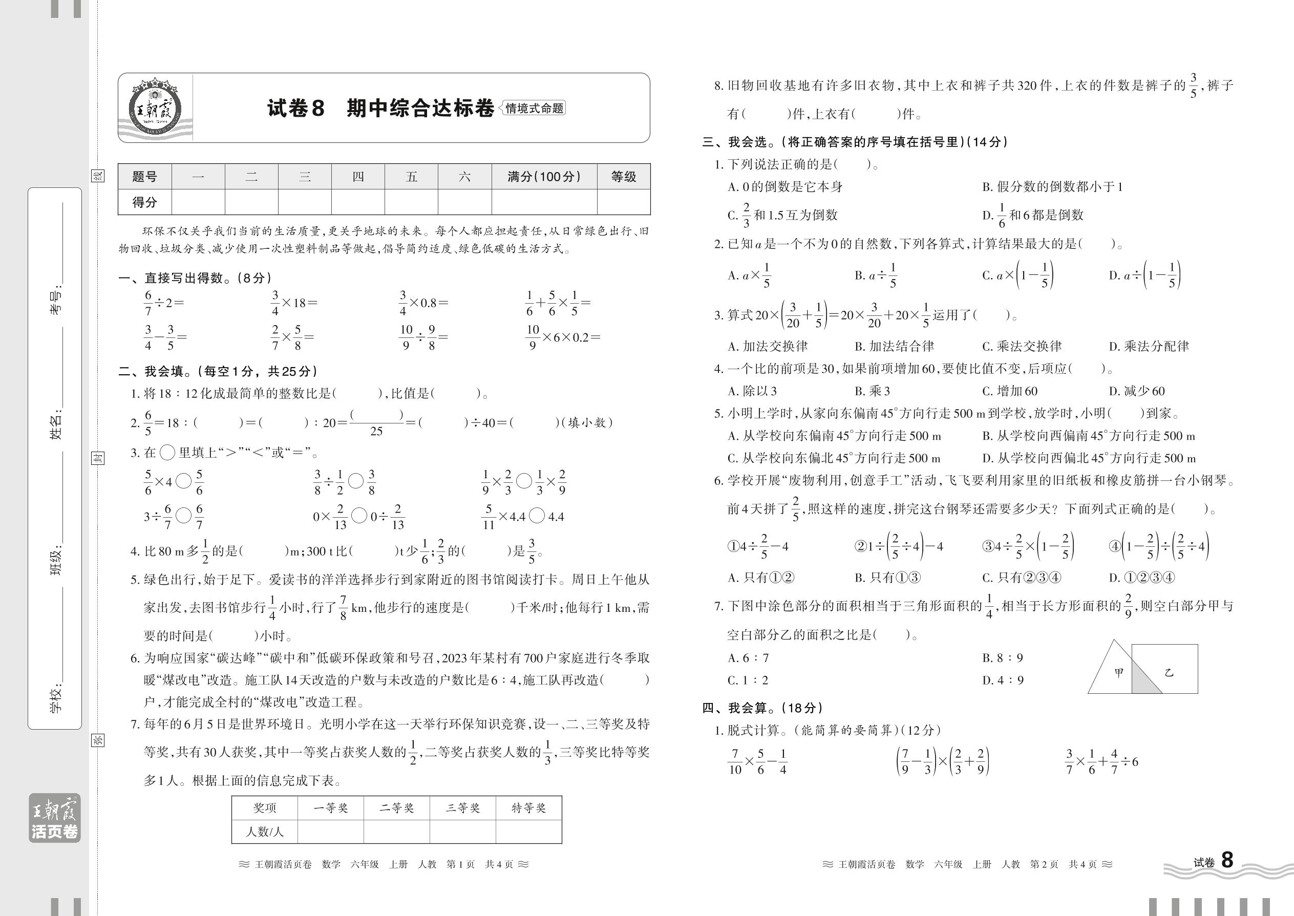 2024秋上册六年级数学人教版 期中综合达标卷【8】