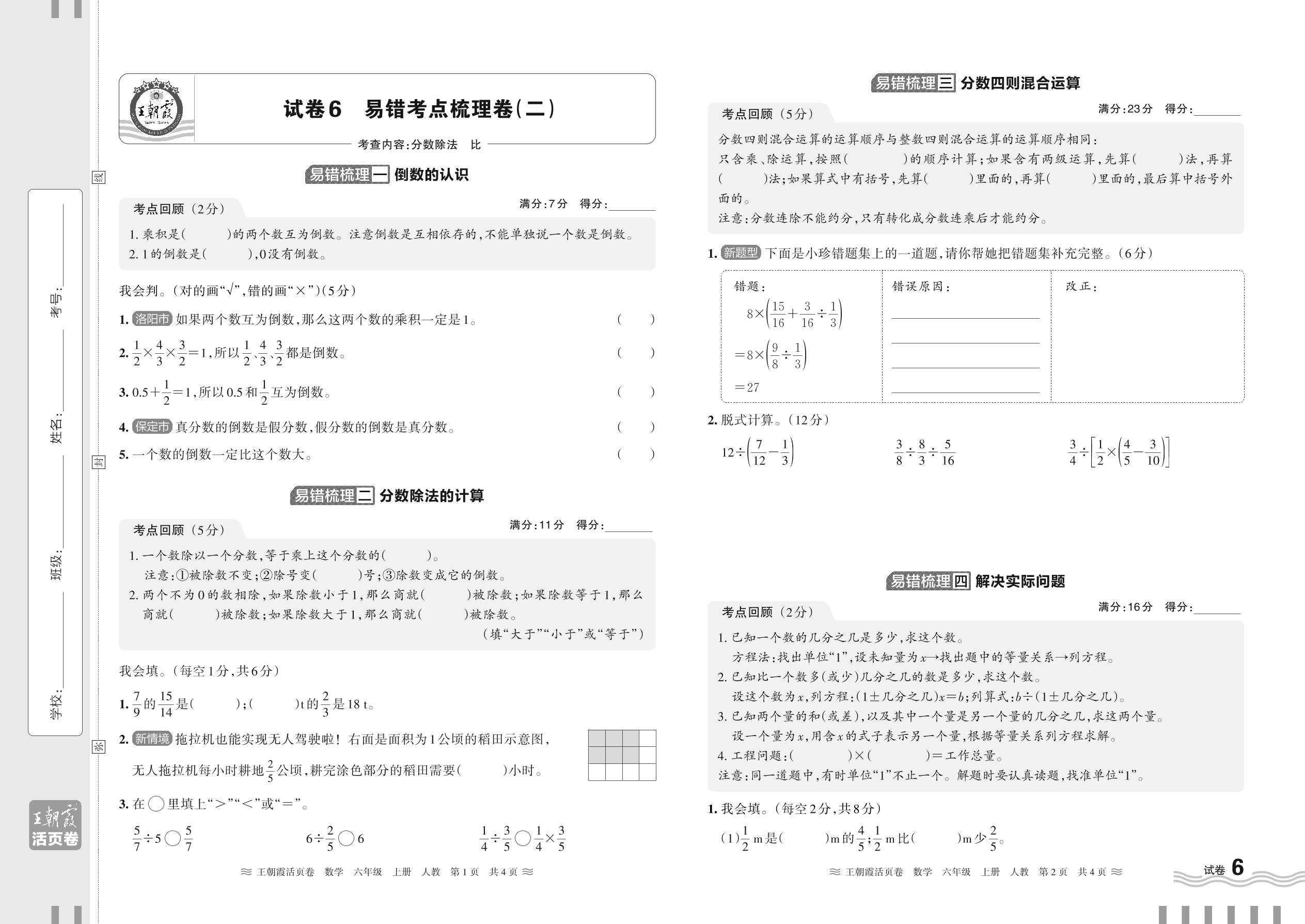 2024秋上册六年级数学人教版 易错考点处理卷:分数除法、比【6】