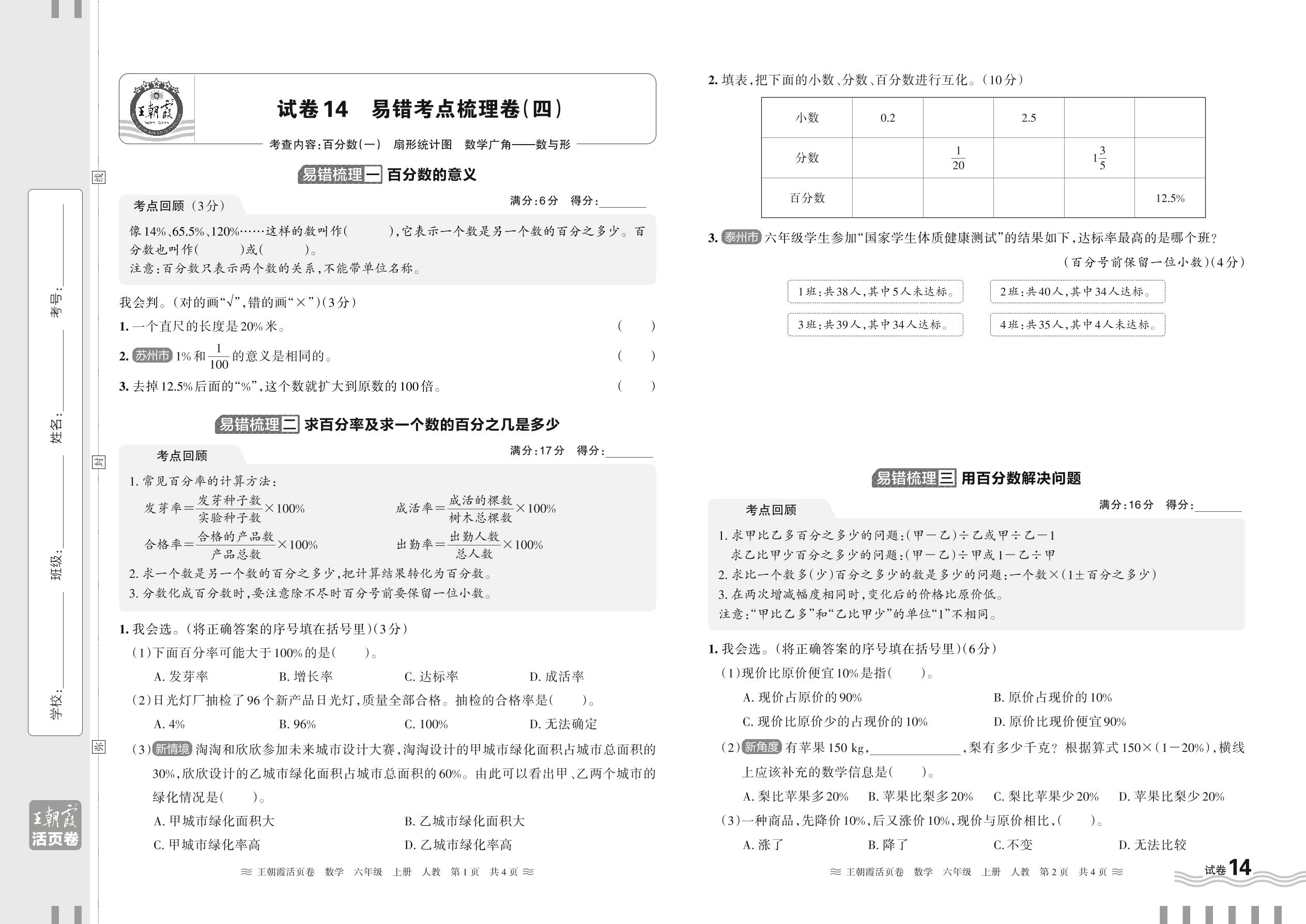 2024秋上册六年级数学人教版 易错考点梳理卷:百分数(一)、扇形统计图、数学广角——数与形【14】