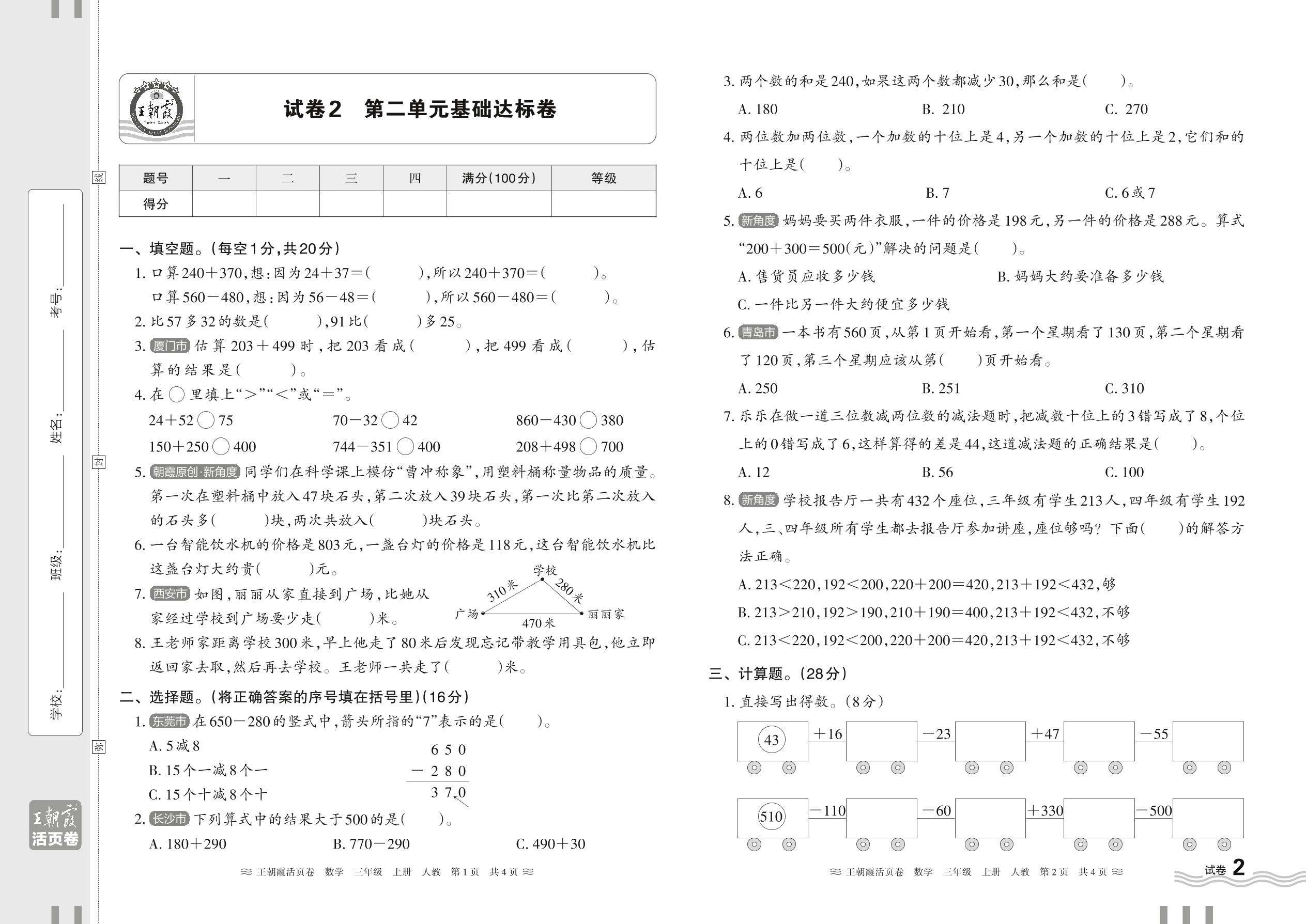 2024秋上册三年级数学人教版 第二单元基础达标卷【2】