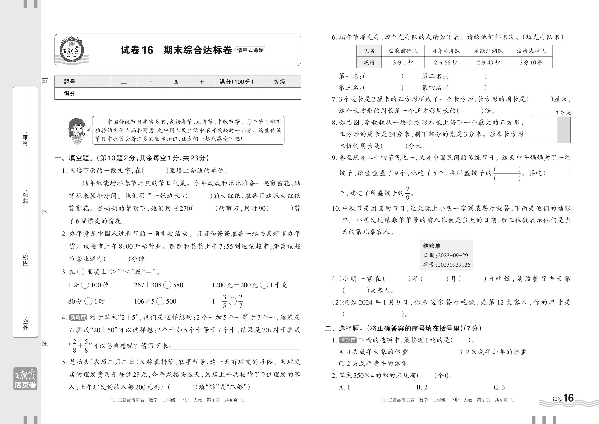 2024秋上册三年级数学人教版 期末综合达标卷【16】