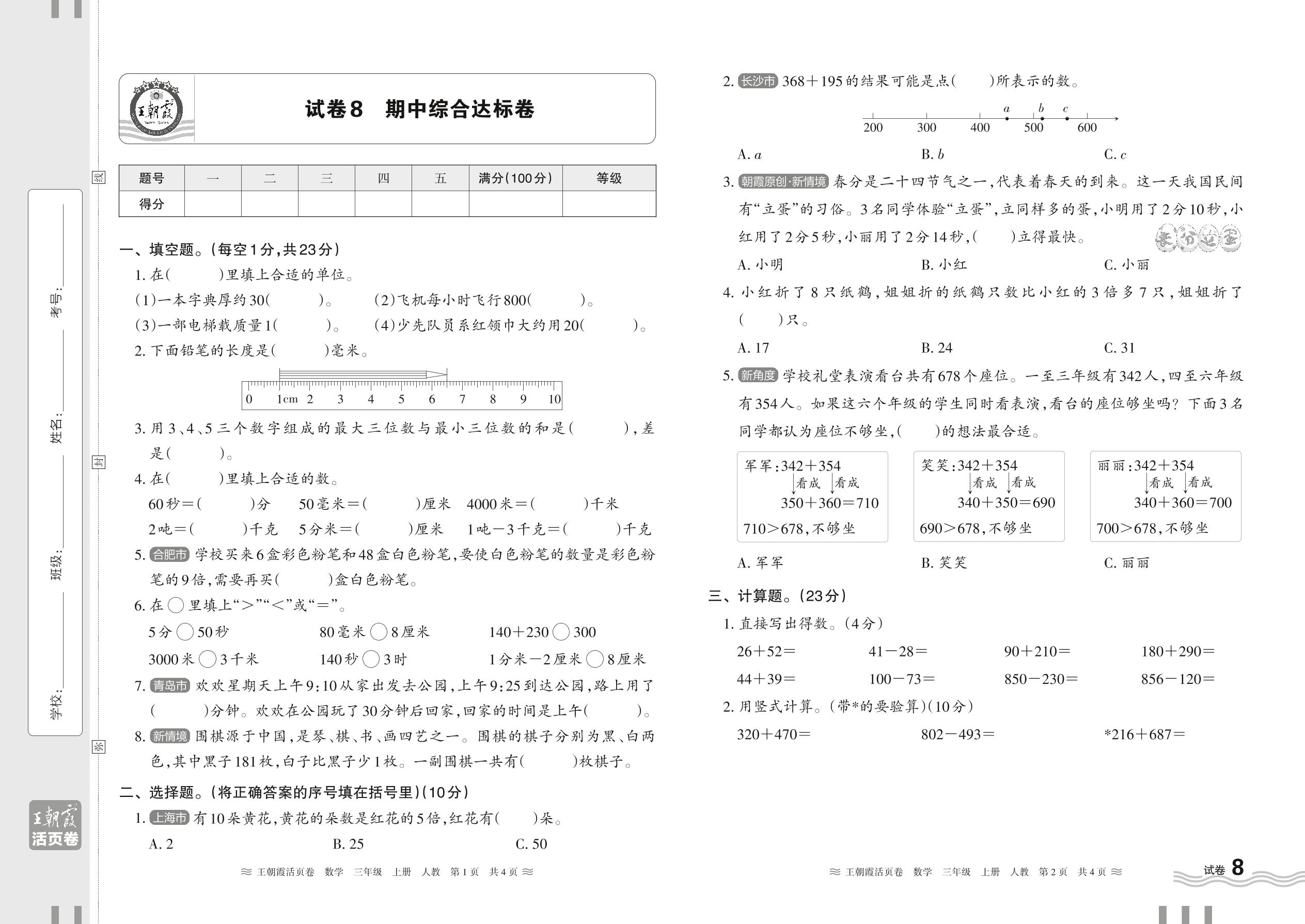 2024秋上册三年级数学人教版 期中综合达标卷【8】
