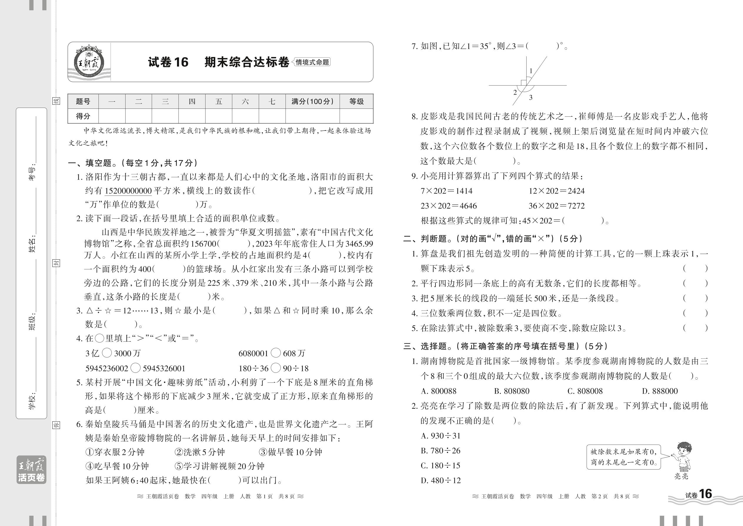 2024秋上册四年级数学人教版 期末综合达标卷【16】