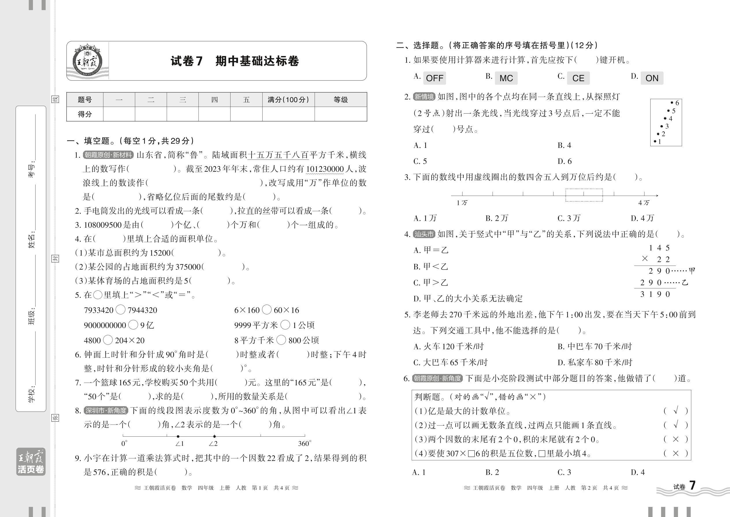 2024秋上册四年级数学人教版 期中基础达标卷【7】