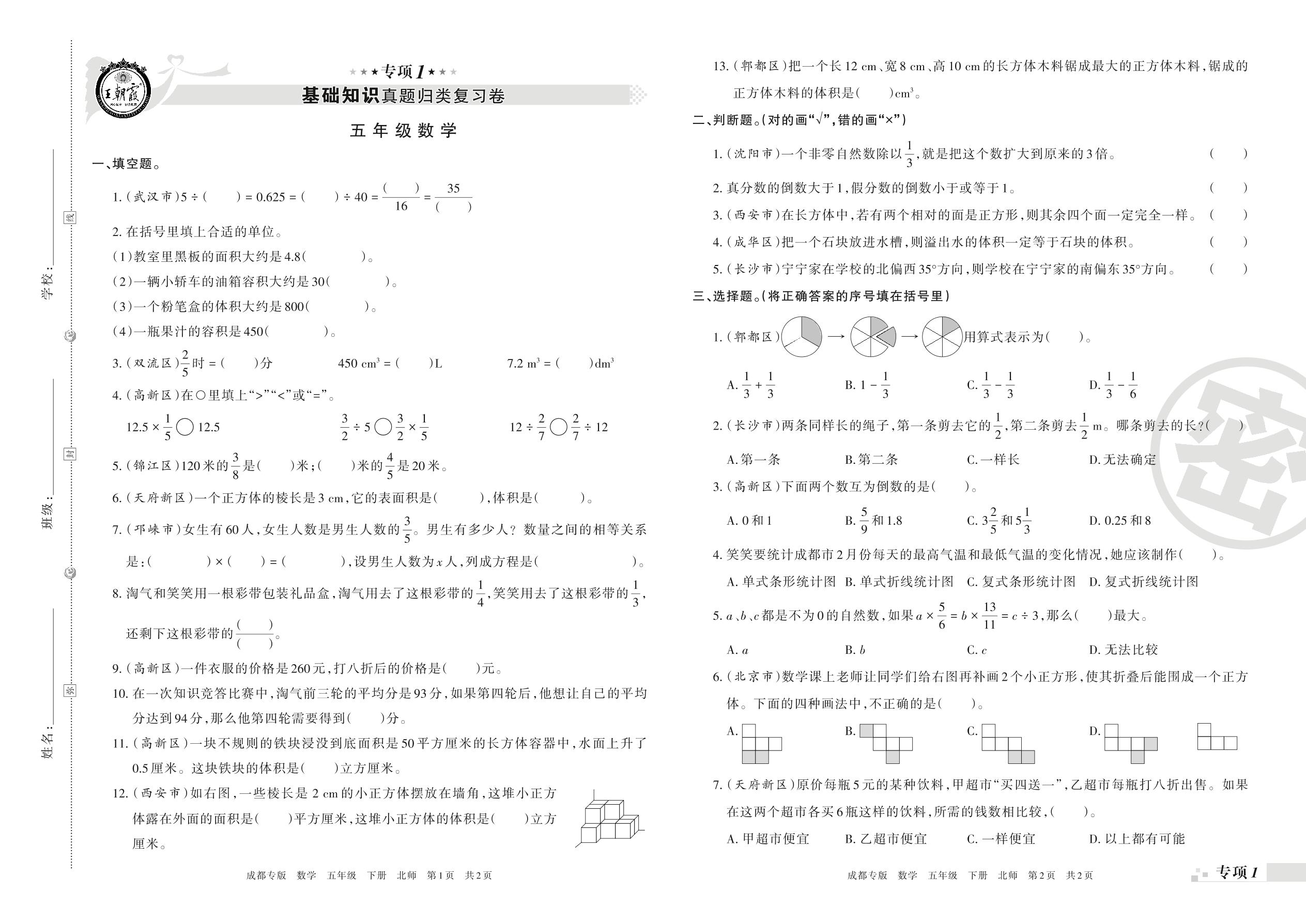 王朝霞期末专项卷——基础知识、基本运算五年级下册数学(北师版)_R210804162030【0】