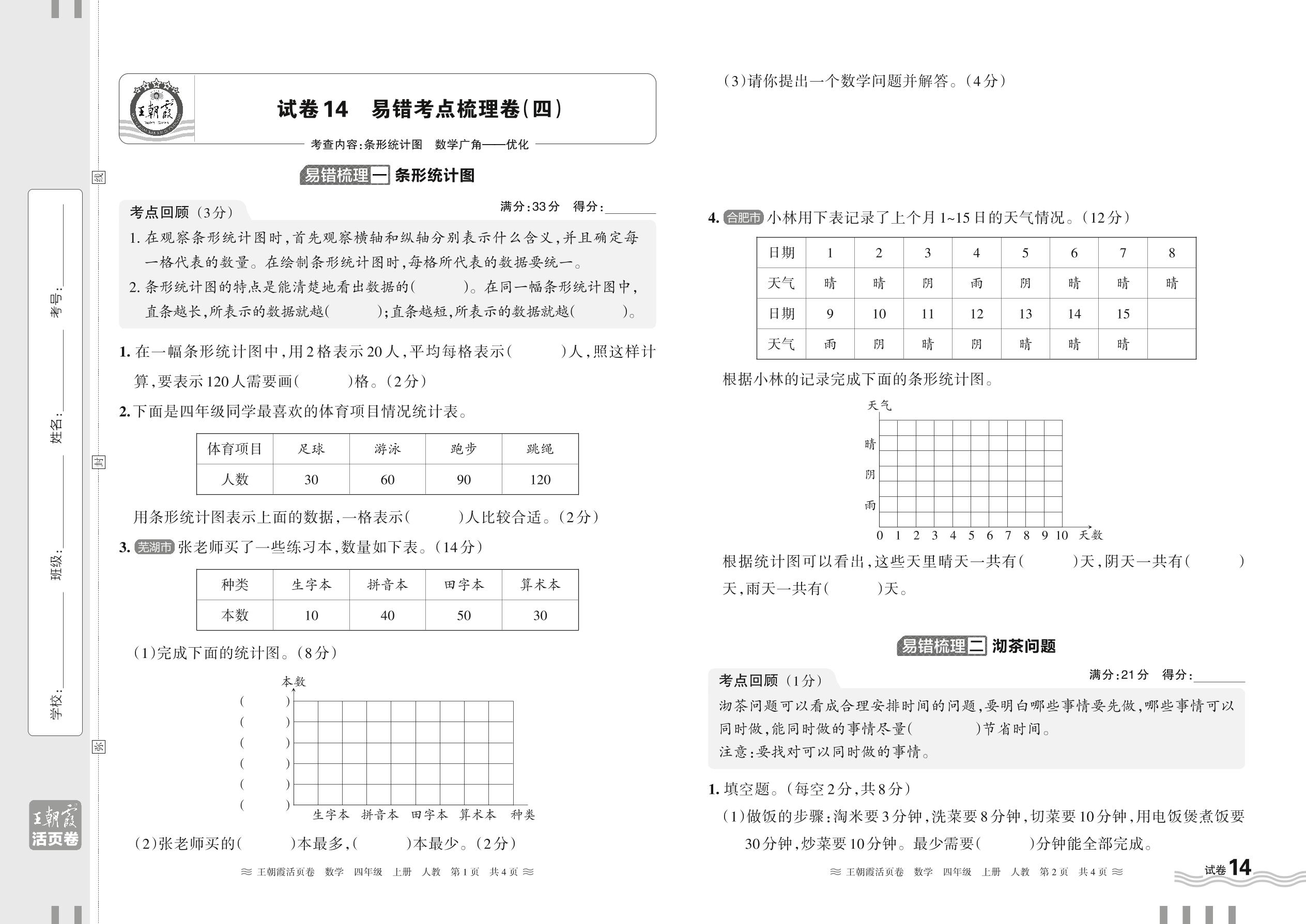 2024秋上册四年级数学人教版 易错考点梳理卷:条形统计图、数学广角——优化【14】