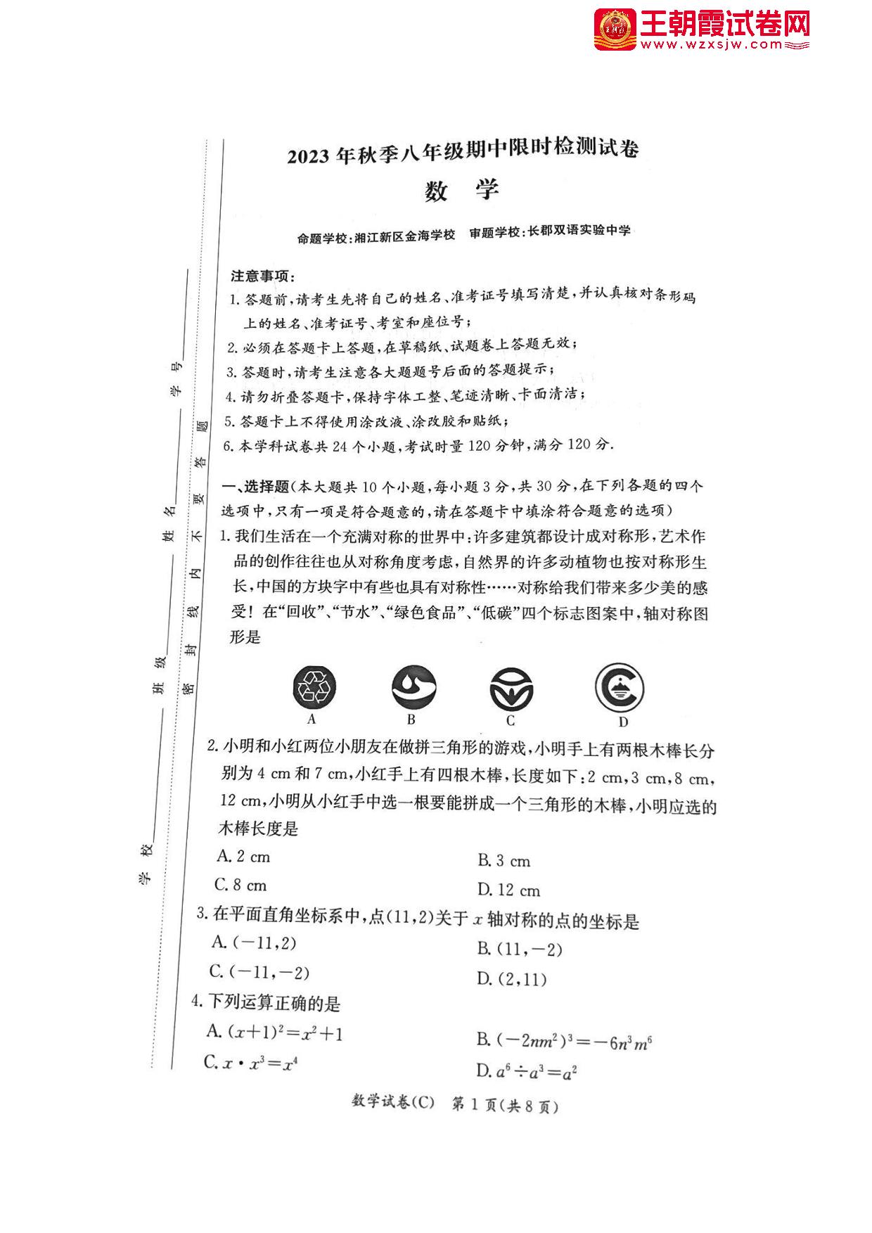 湖南省长沙市长郡教育集团2023-2024学年上学期期中限时检测试卷八年级数学(湘教版)