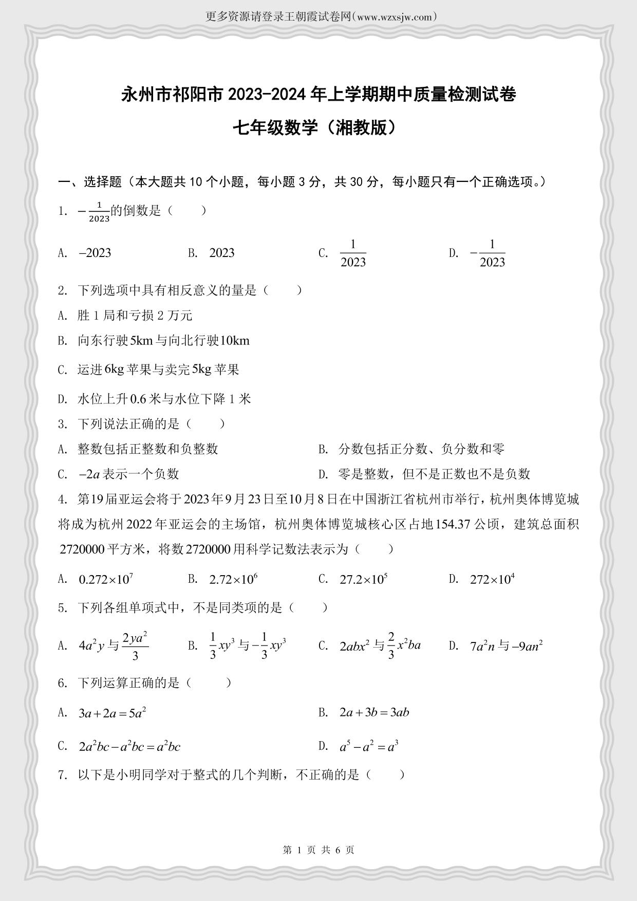 湖南省永州市祁阳市2023-2024学年上学期期中质量检测试卷七年级数学(湘教版)