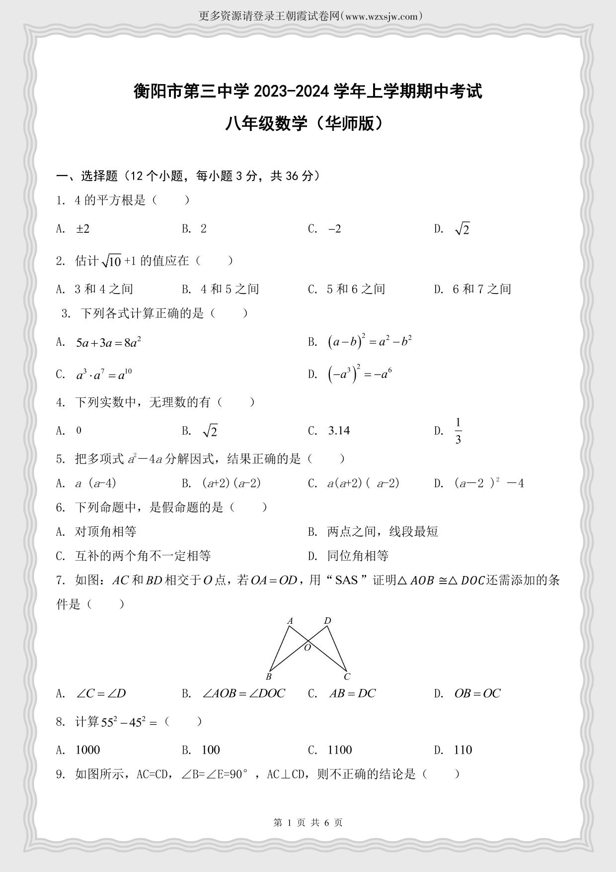 湖南省衡阳市第三中学2023-2024学年上学期期中考试八年级数学(华师版)