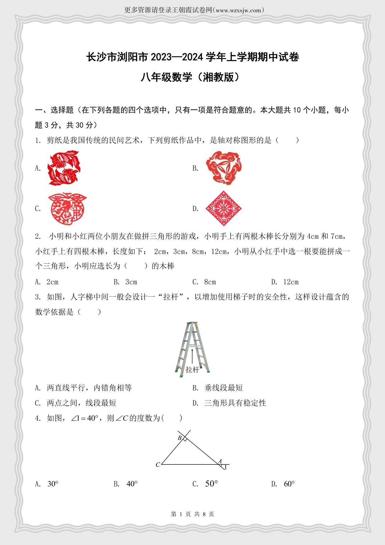 湖南省长沙市浏阳市2023-2024学年上学期期中考试试卷八年级数学(湘教版)