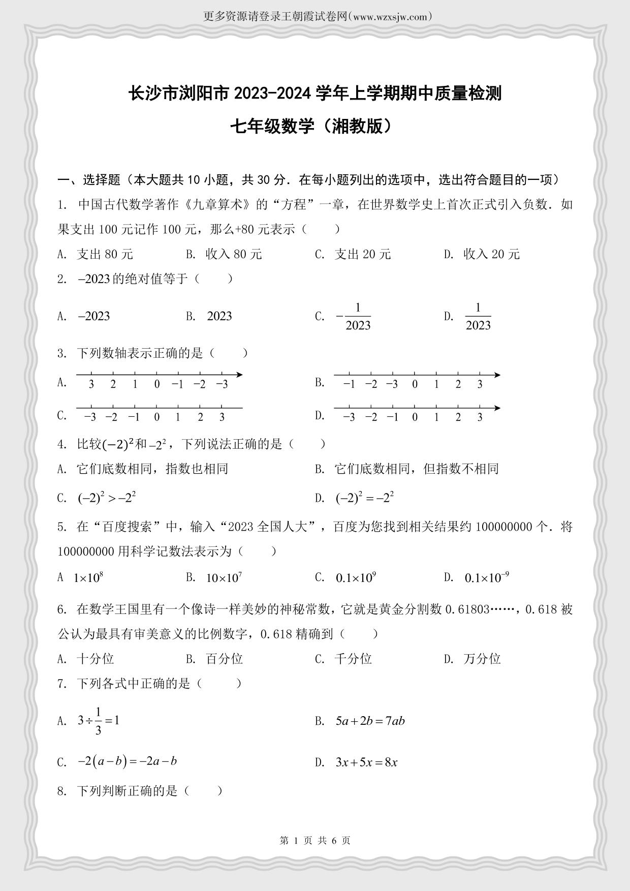 七年级数学湘教版上册期中卷