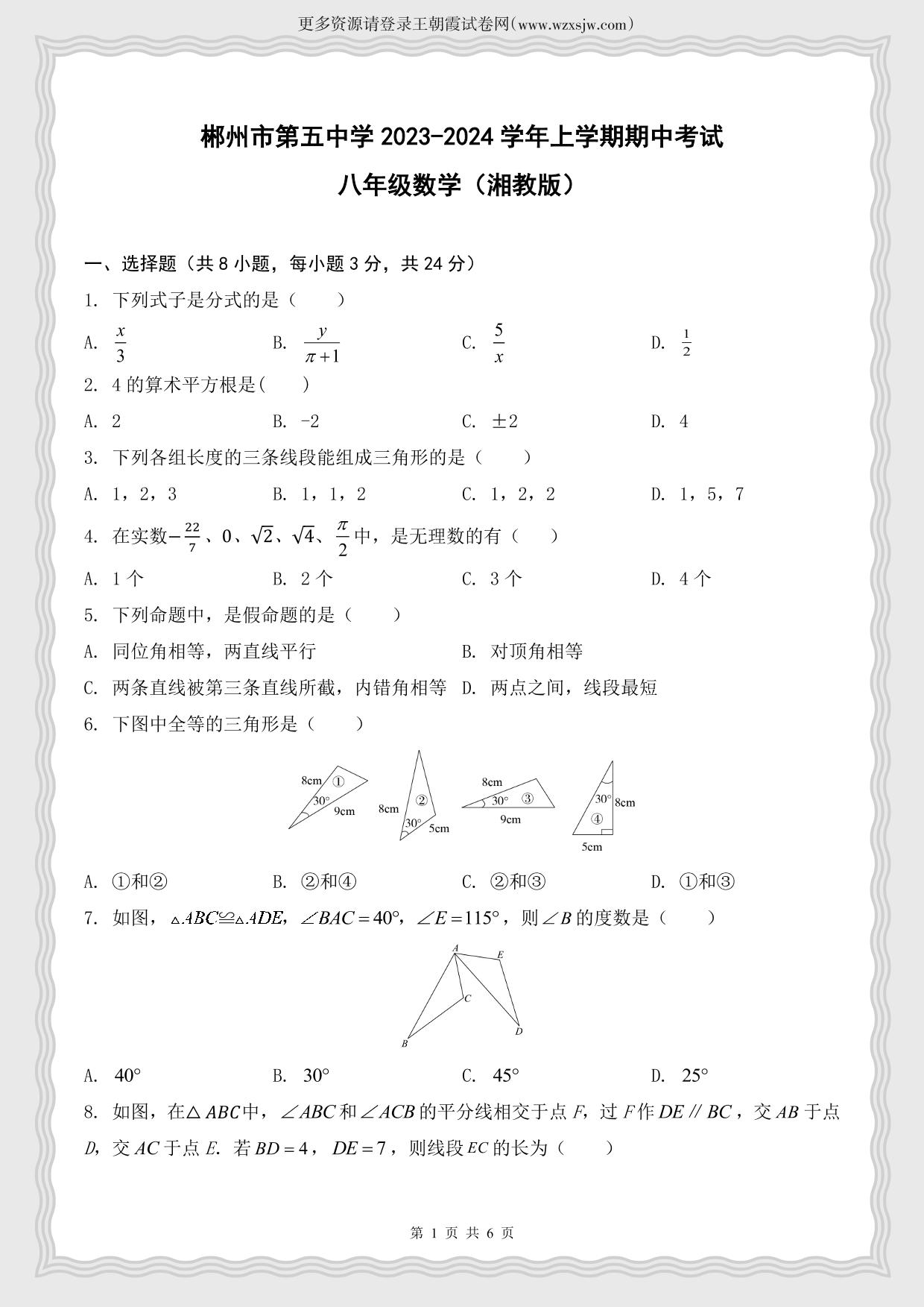 湖南省郴州市第五中学2023-2024学年上学期期中考试八年级数学(湘教版)
