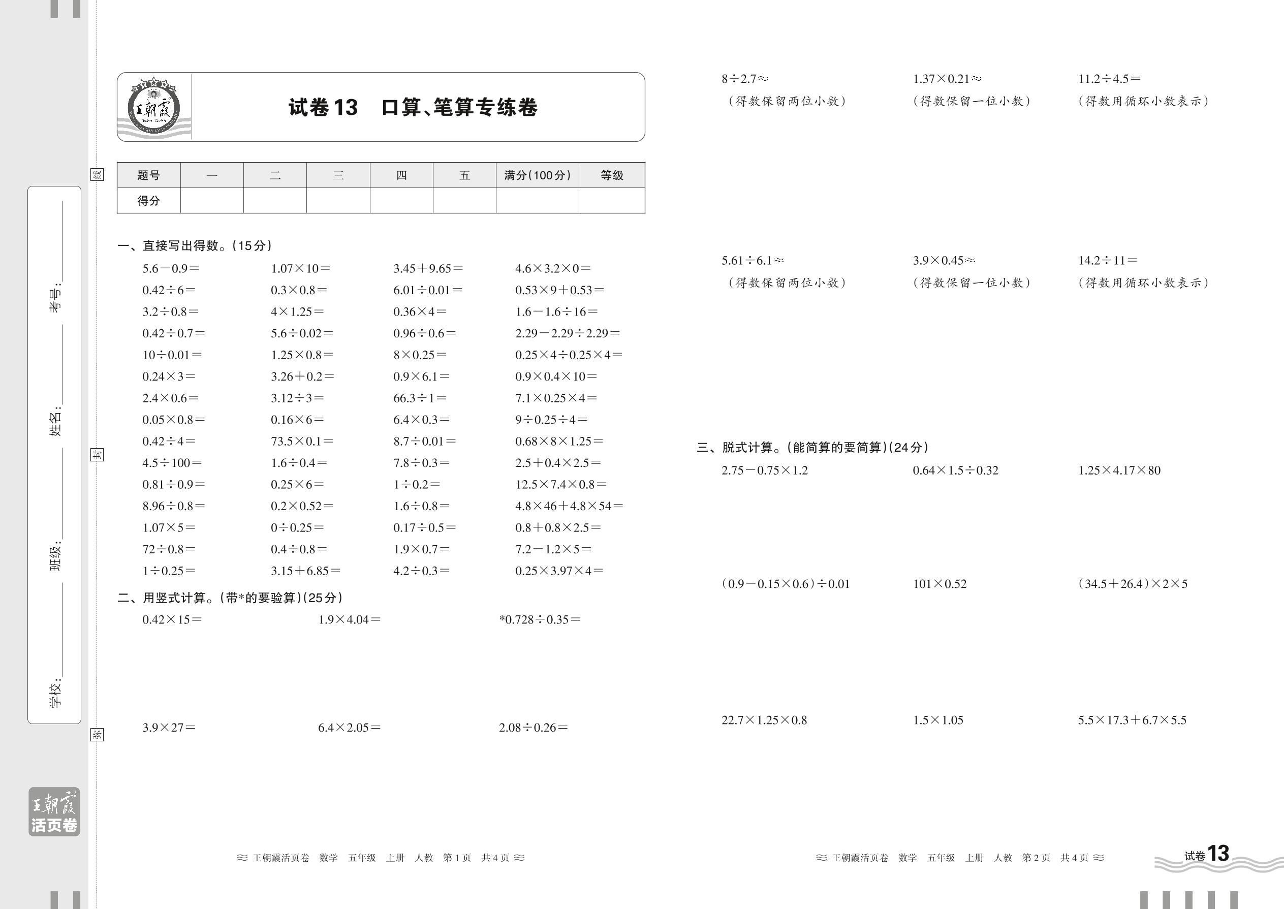 2024秋上册五年级数学人教版 口算、笔算专练卷【13】