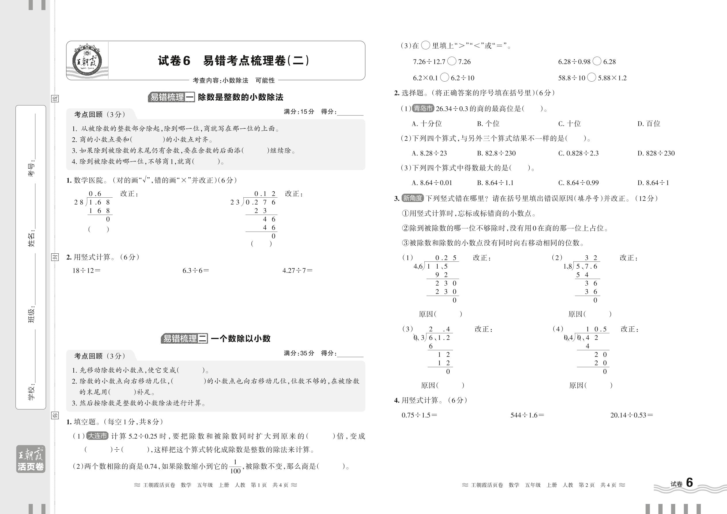 2024秋上册五年级数学人教版 易错考点处理卷:小数除法、可能性【6】