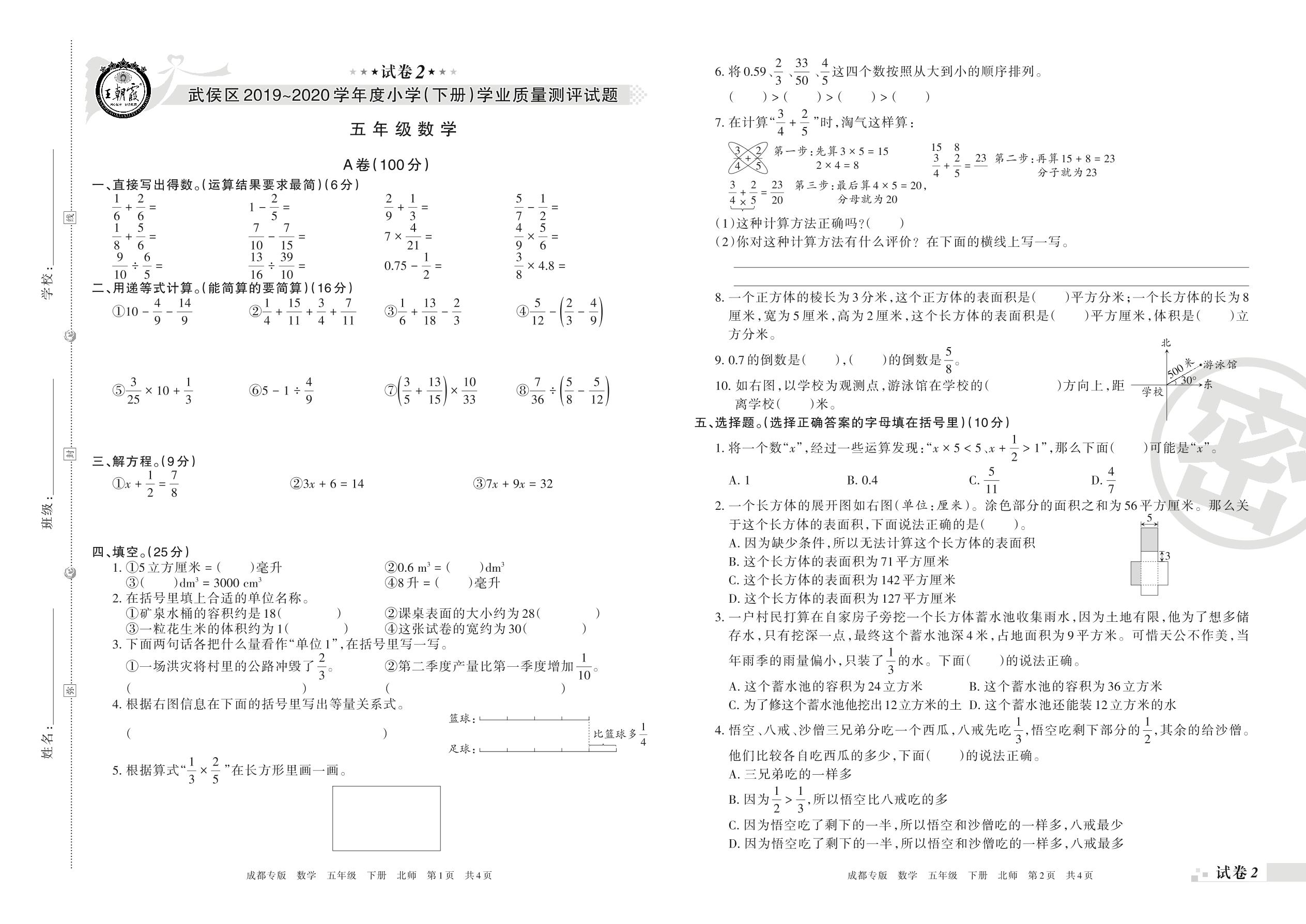 2019-2020学年第二学期成都市武侯区五年级数学试卷(北师版)【2】