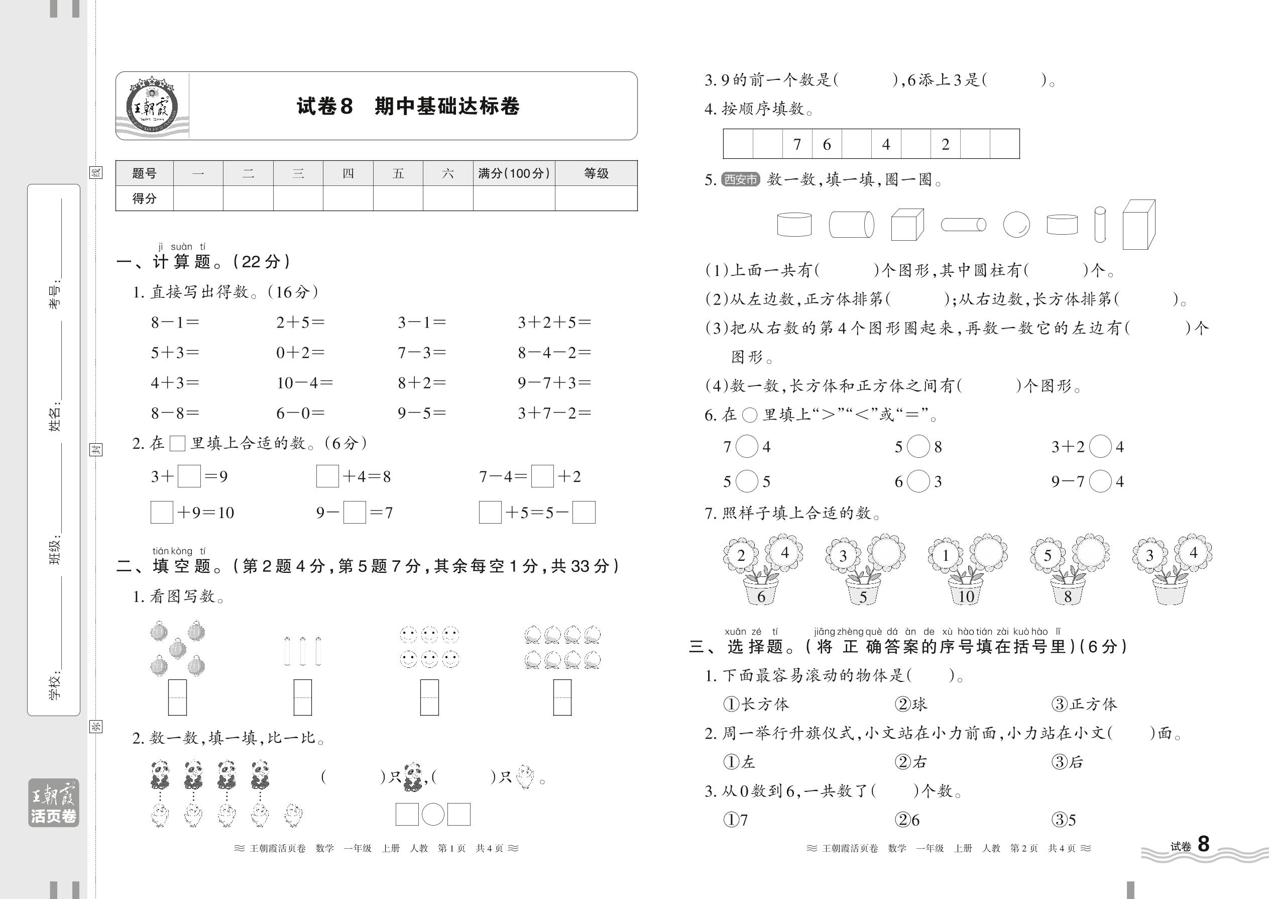 2024秋上册一年级数学人教版 期中基础达标卷【8】