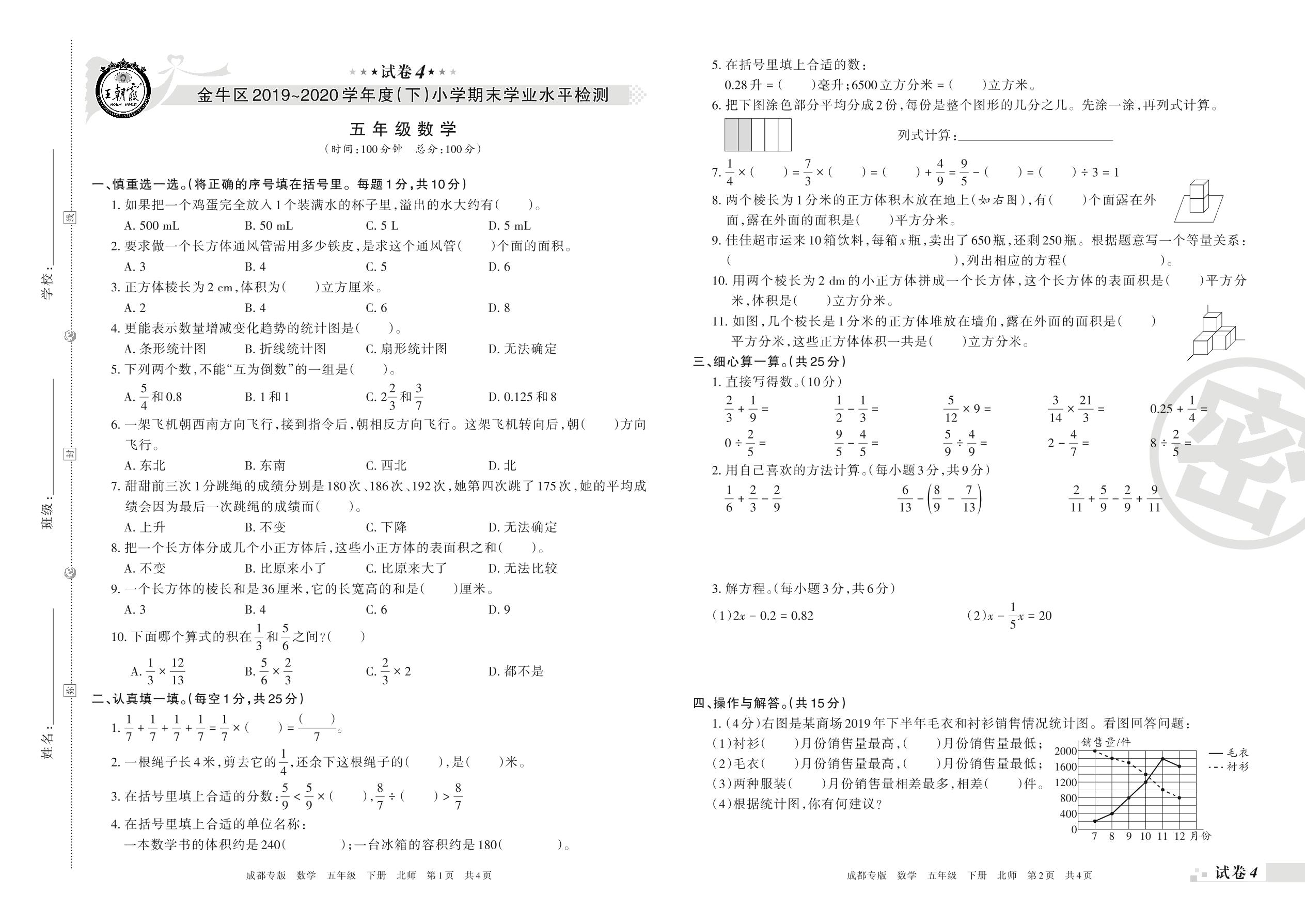 2019-2020学年第二学期成都市金牛区五年级数学试卷(北师版)【4】