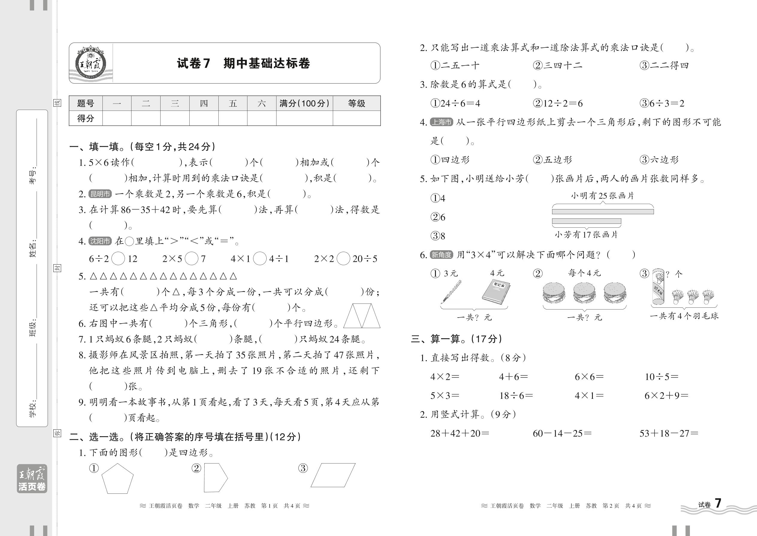 二年级数学苏教版上册期中卷