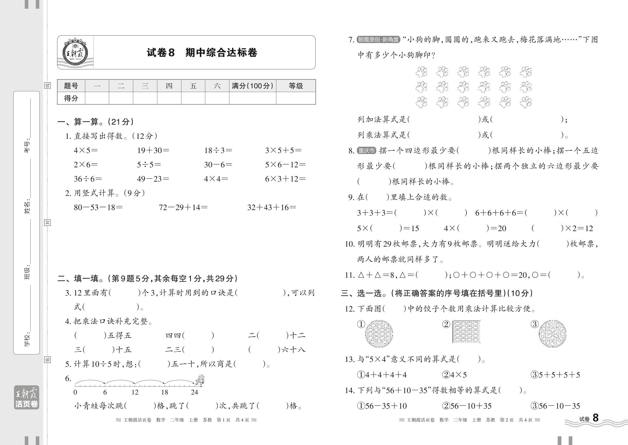二年级数学苏教版上册期中卷