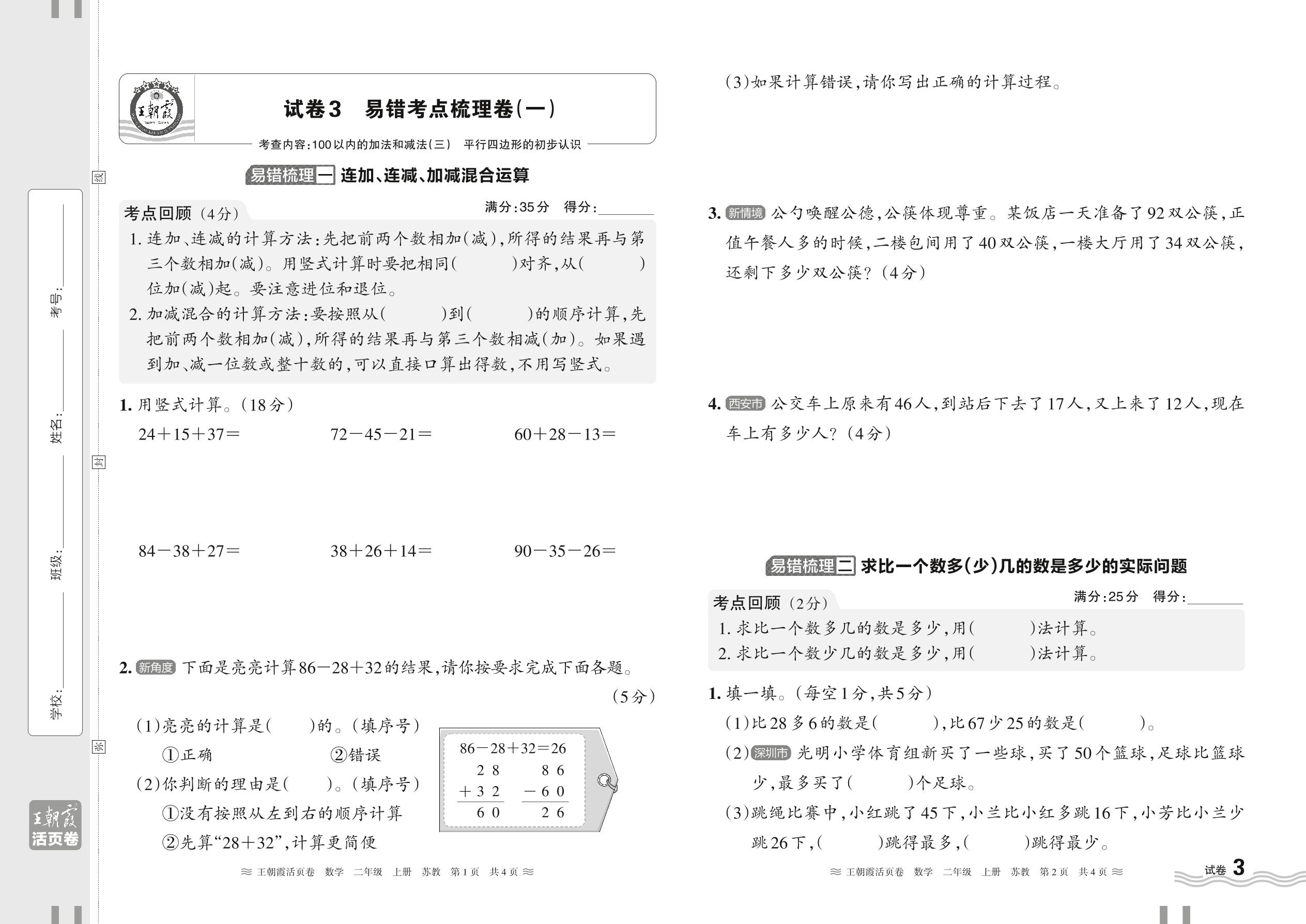 2024秋上册二年级数学苏教版 易错考点梳理卷:100以内的加法和减法(三)、平行四边形的初步认识【3】