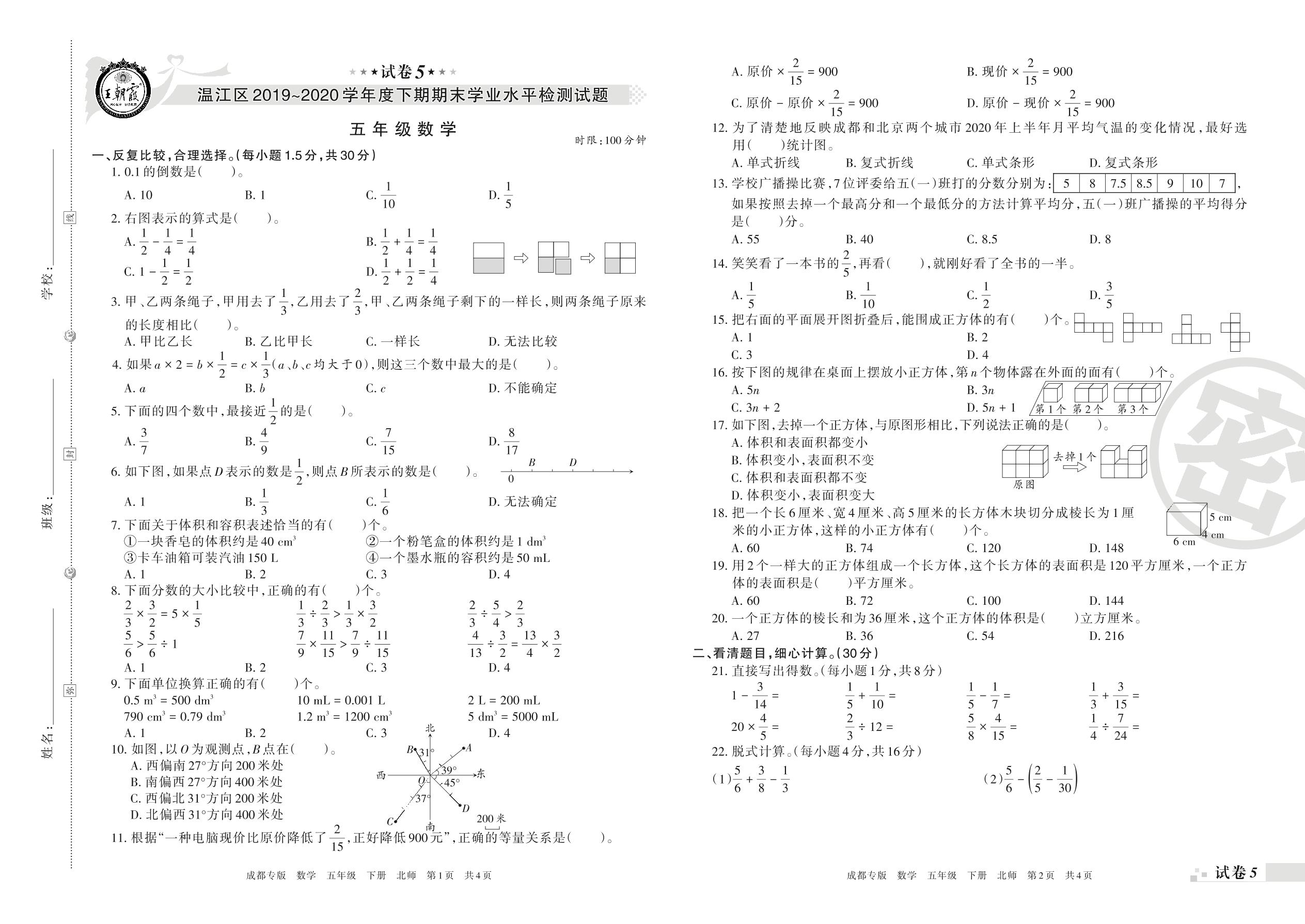 2019-2020学年第二学期成都市温江区五年级数学试卷(北师版)【5】
