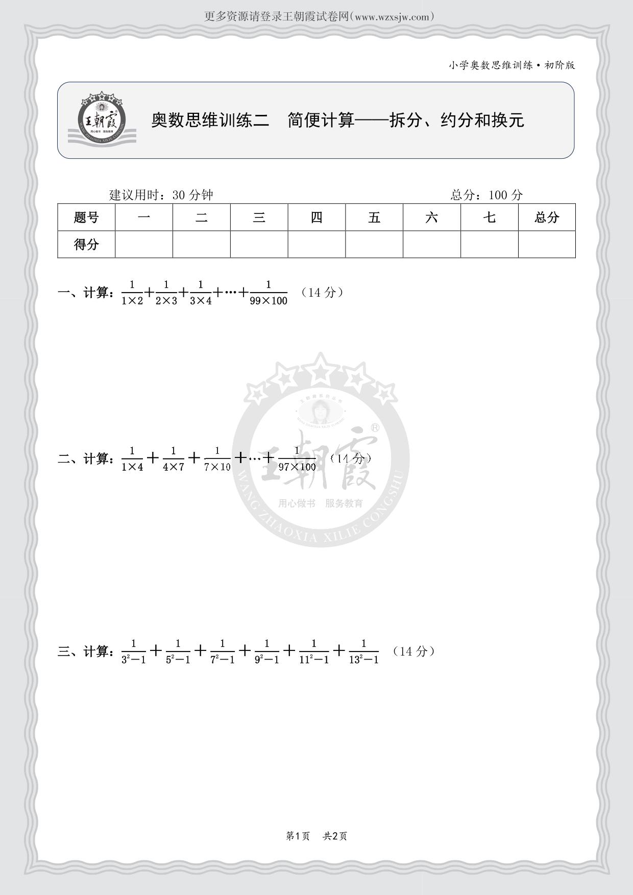 小学奥数思维训练二 简便计算——拆分、约分和换元(初阶版)