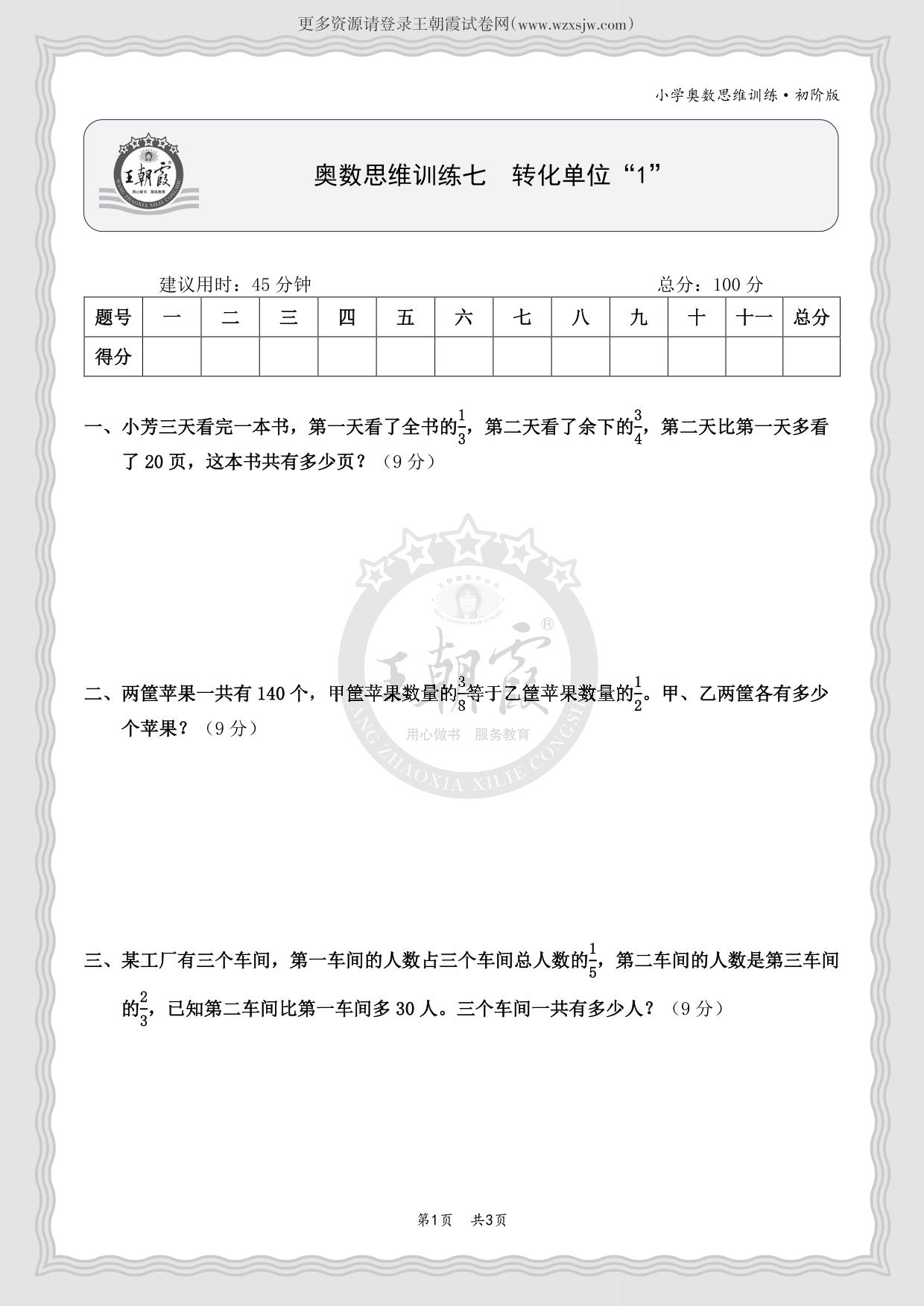 小学奥数思维训练七 转化单位“1”(初阶版)