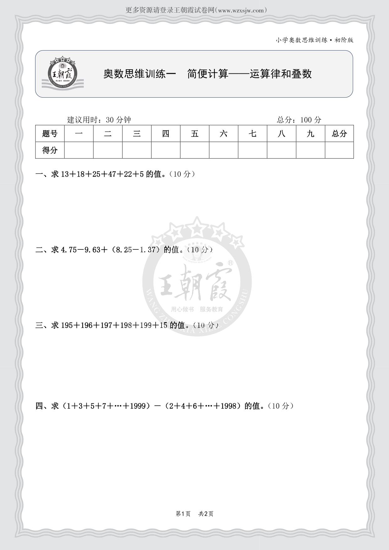 小学奥数思维训练一 简便计算——运算律和叠数(初阶版)