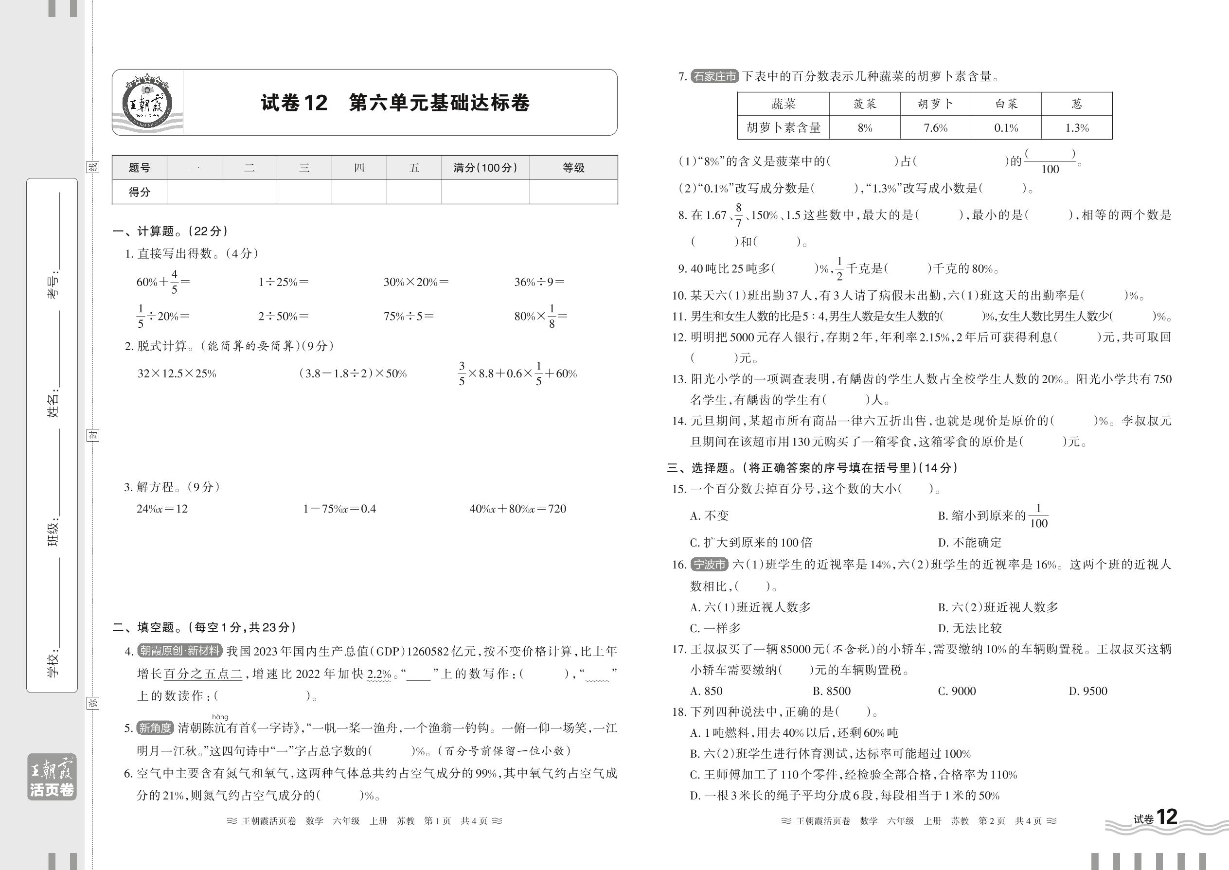 2024秋上册六年级数学苏教版 第六单元基础达标卷【12】