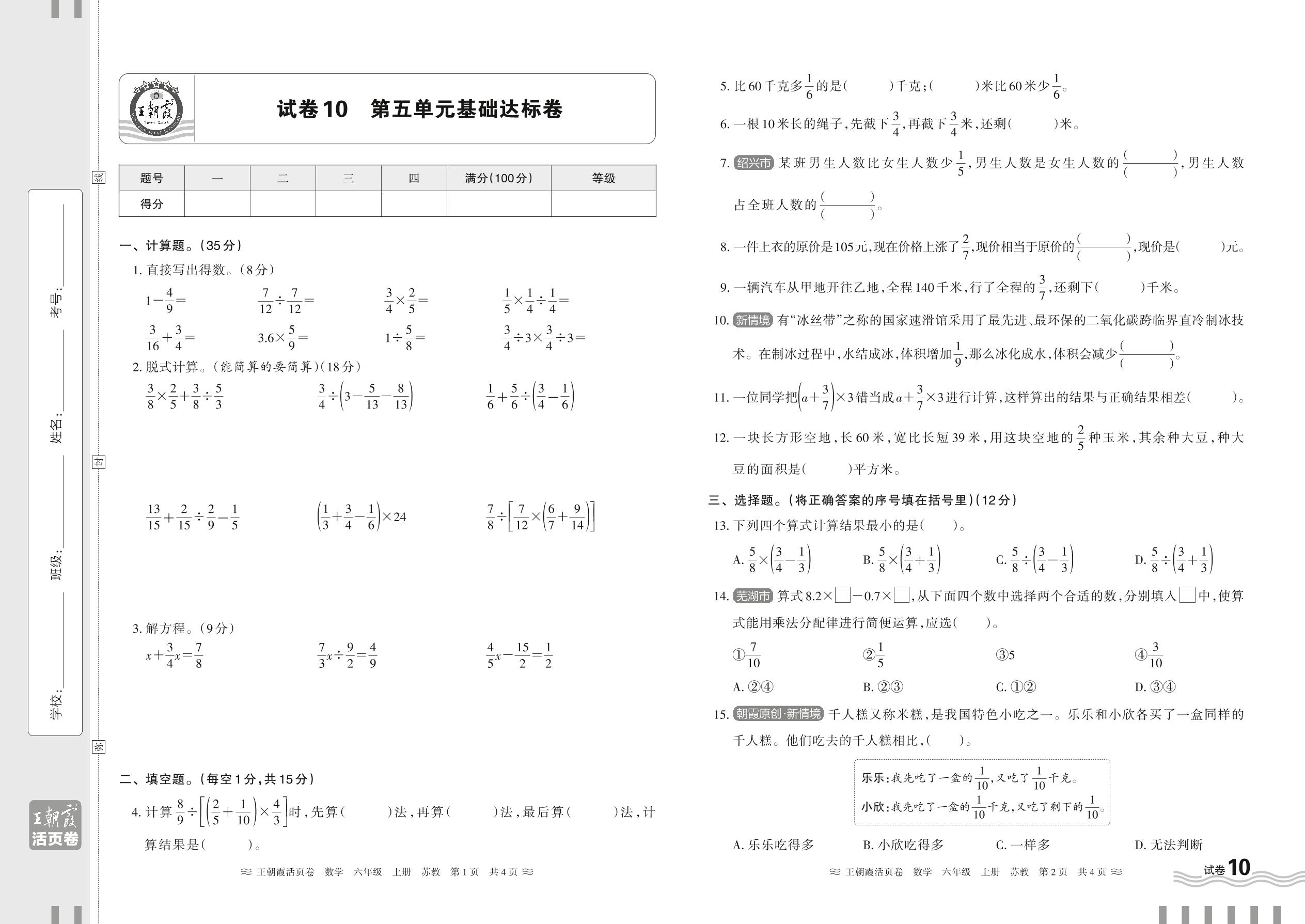2024秋上册六年级数学苏教版 第五单元基础达标卷【10】