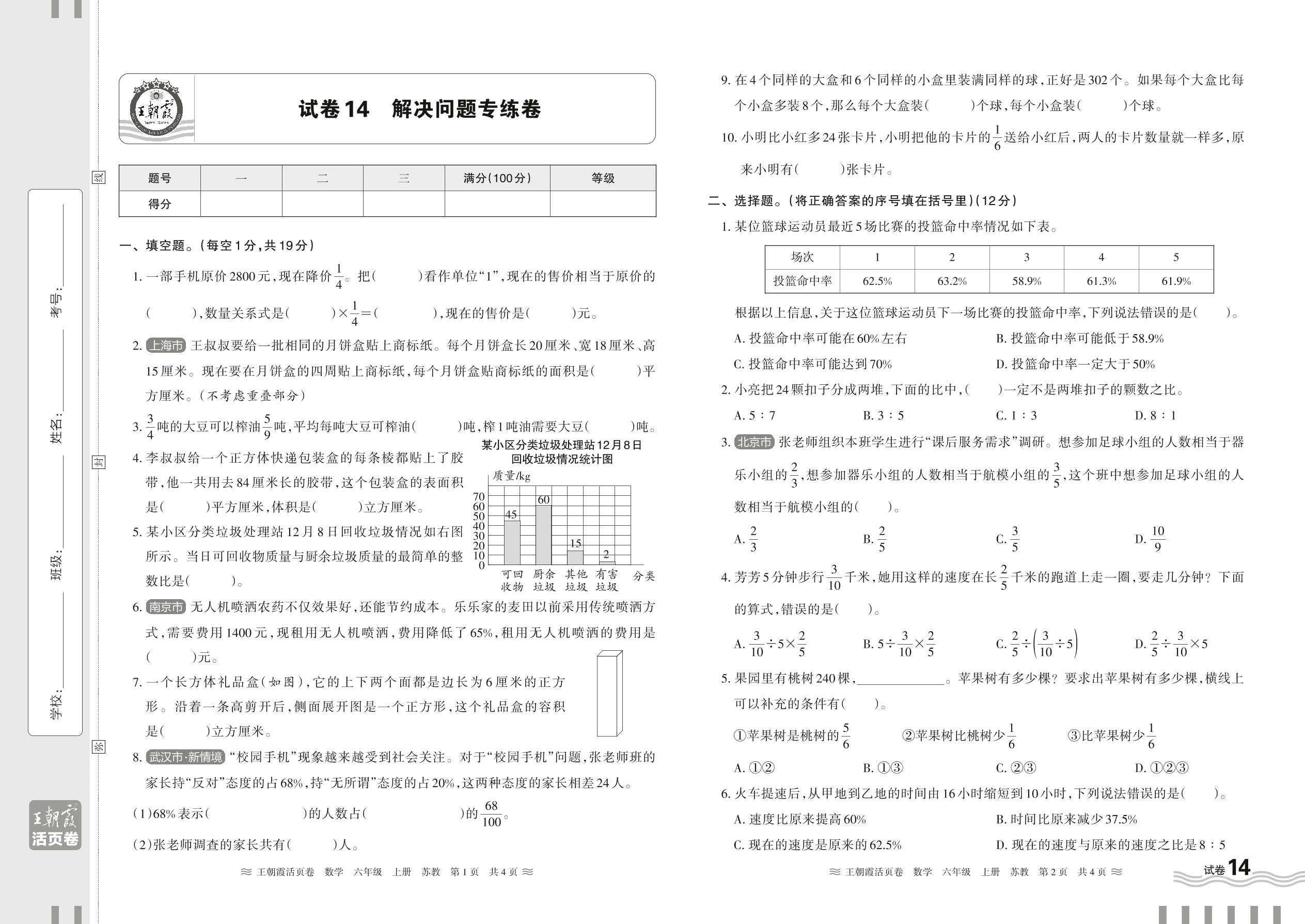 2024秋上册六年级数学苏教版 解决问题专练卷【14】