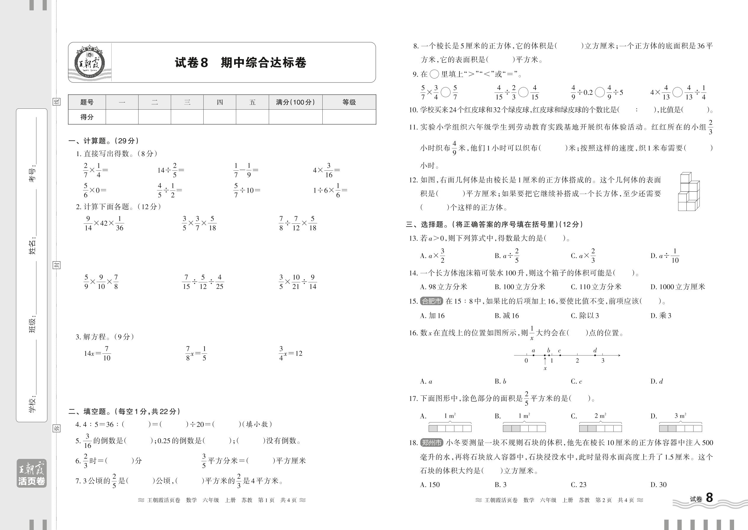 2024秋上册六年级数学苏教版 期中综合达标卷【8】