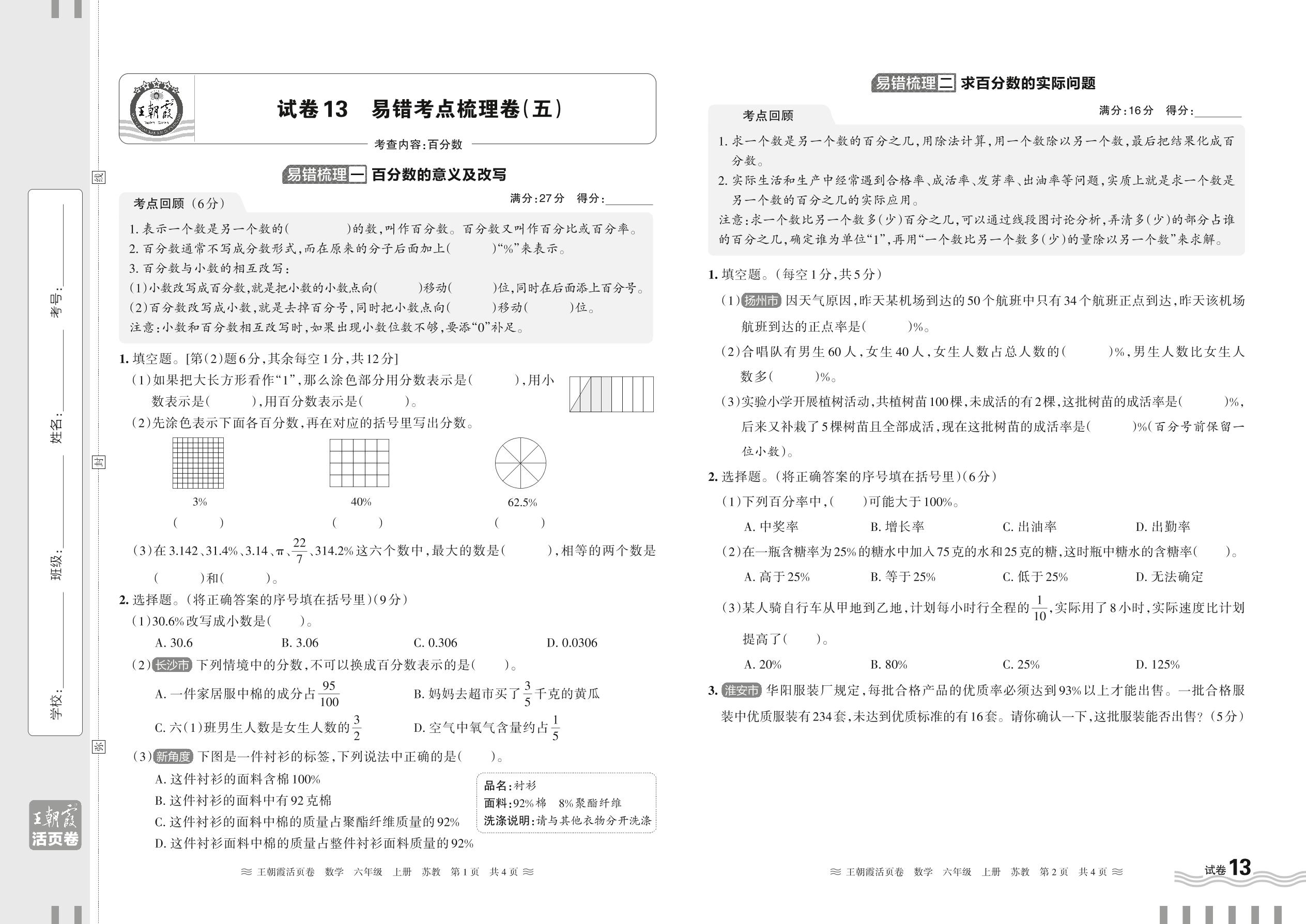 2024秋上册六年级数学苏教版 易错考点梳理卷:百分数【13】