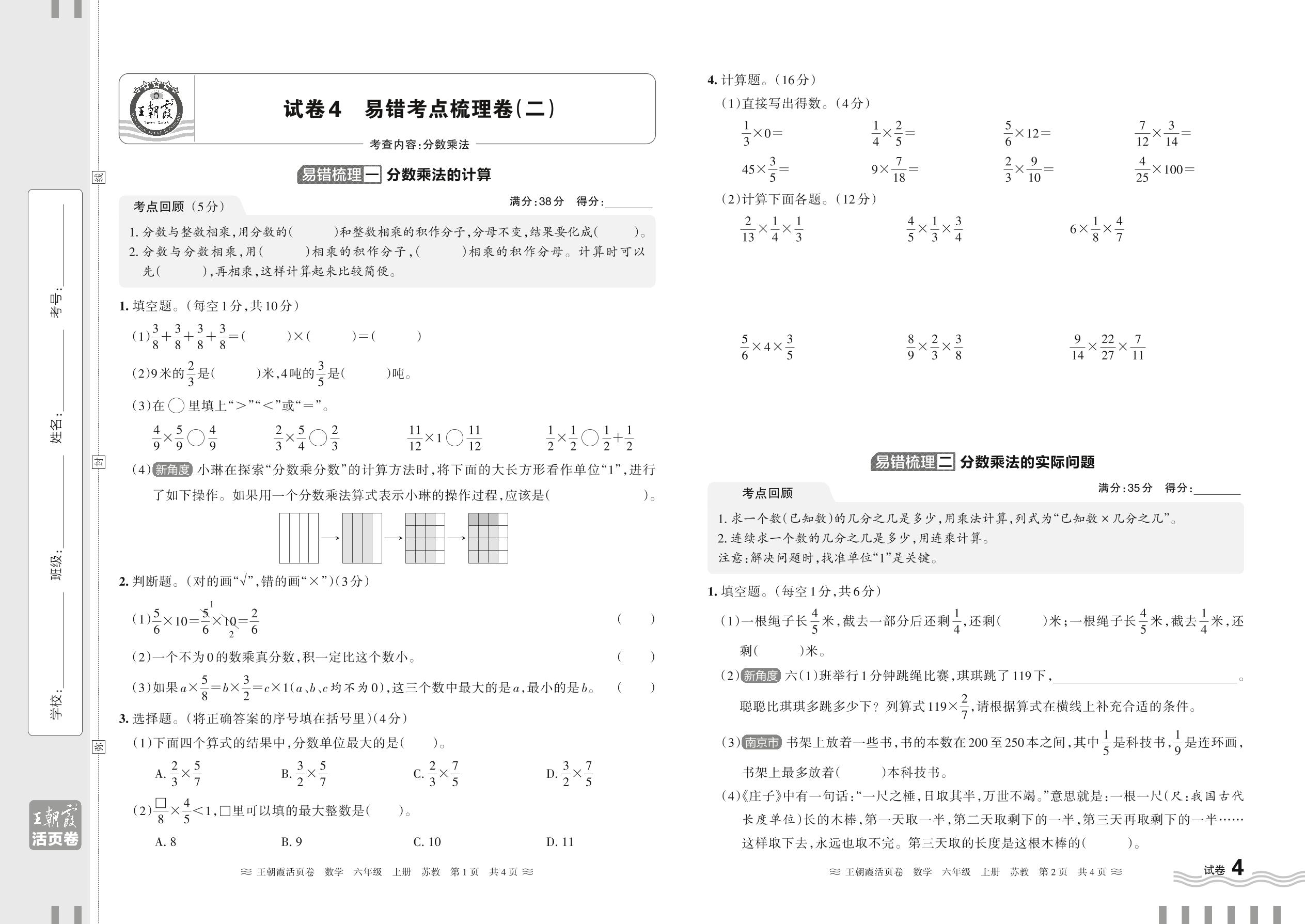 2024秋上册六年级数学苏教版 易错考点梳理卷:分数乘法【4】