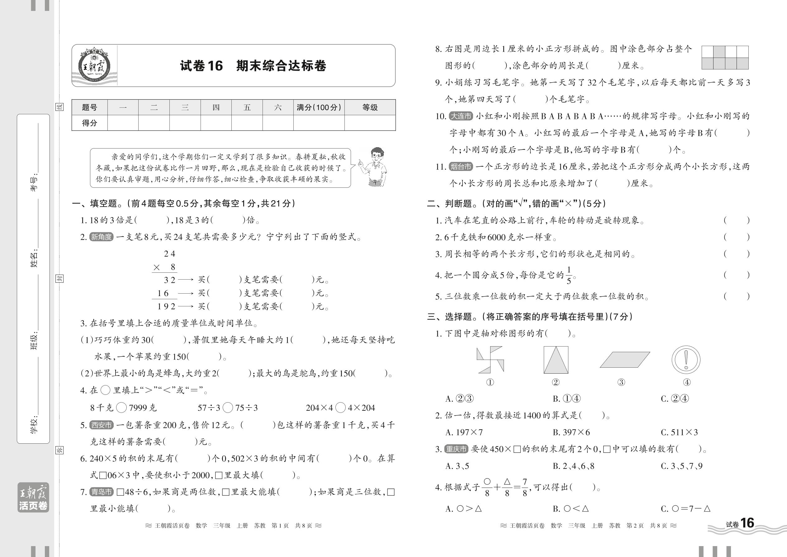 2024秋上册三年级数学苏教版 期末综合达标卷【16】