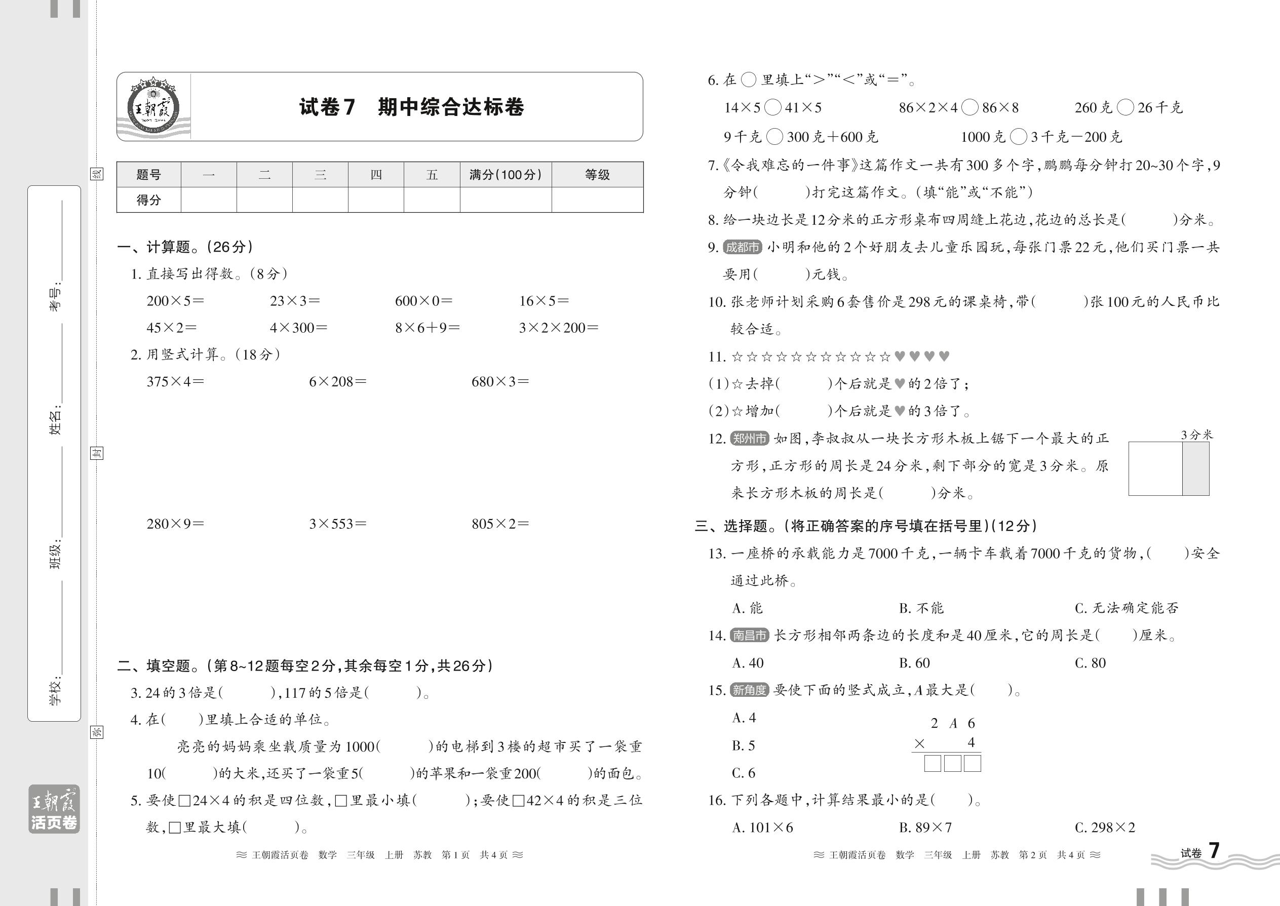 2024秋上册三年级数学苏教版 期中综合达标卷【7】