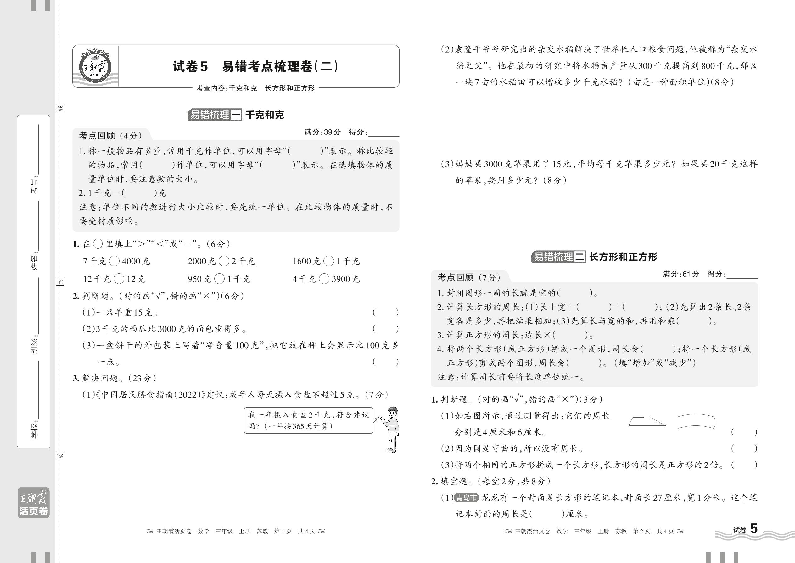 2024秋上册三年级数学苏教版 易错考点梳理卷:千克和克、长方形和正方形【5】