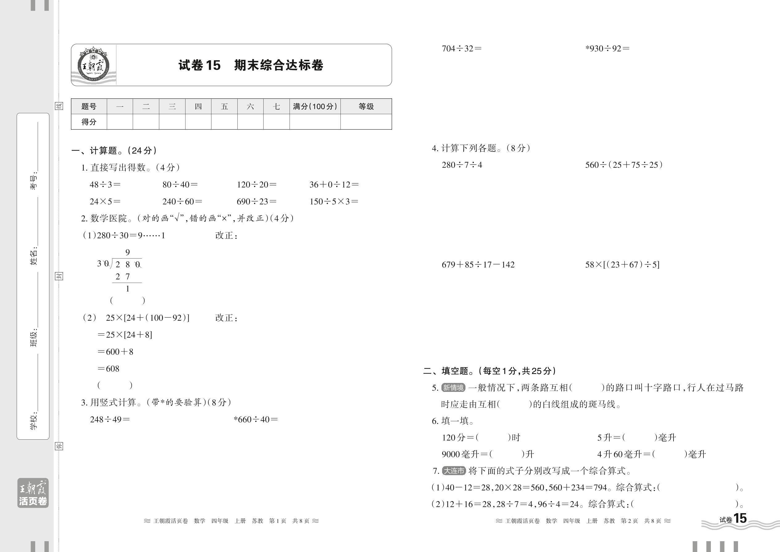 2024秋上册四年级数学苏教版 期末综合达标卷【15】