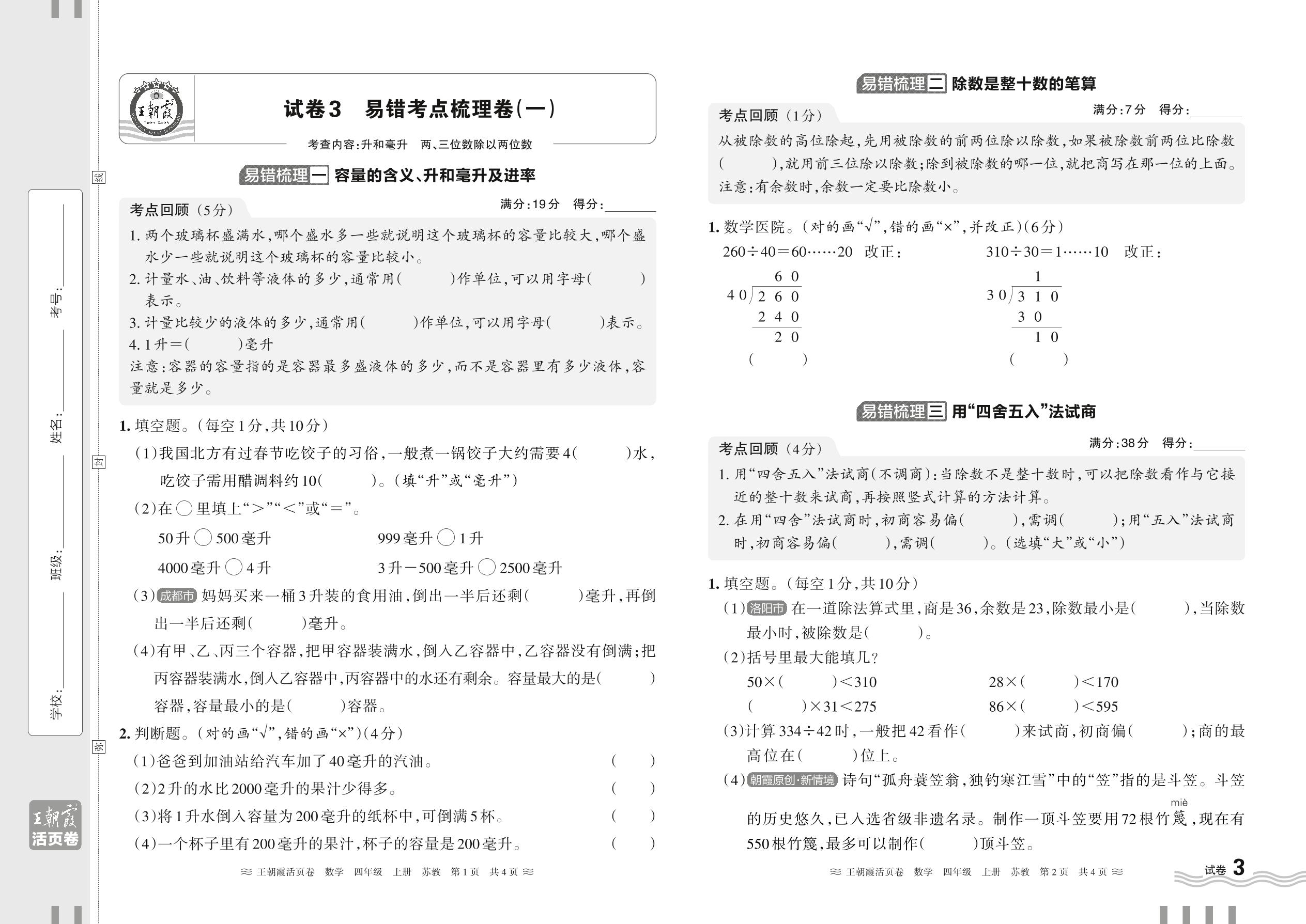 2024秋上册四年级数学苏教版 易错考点梳理卷:升和毫升 两、三位数除以两位数【3】