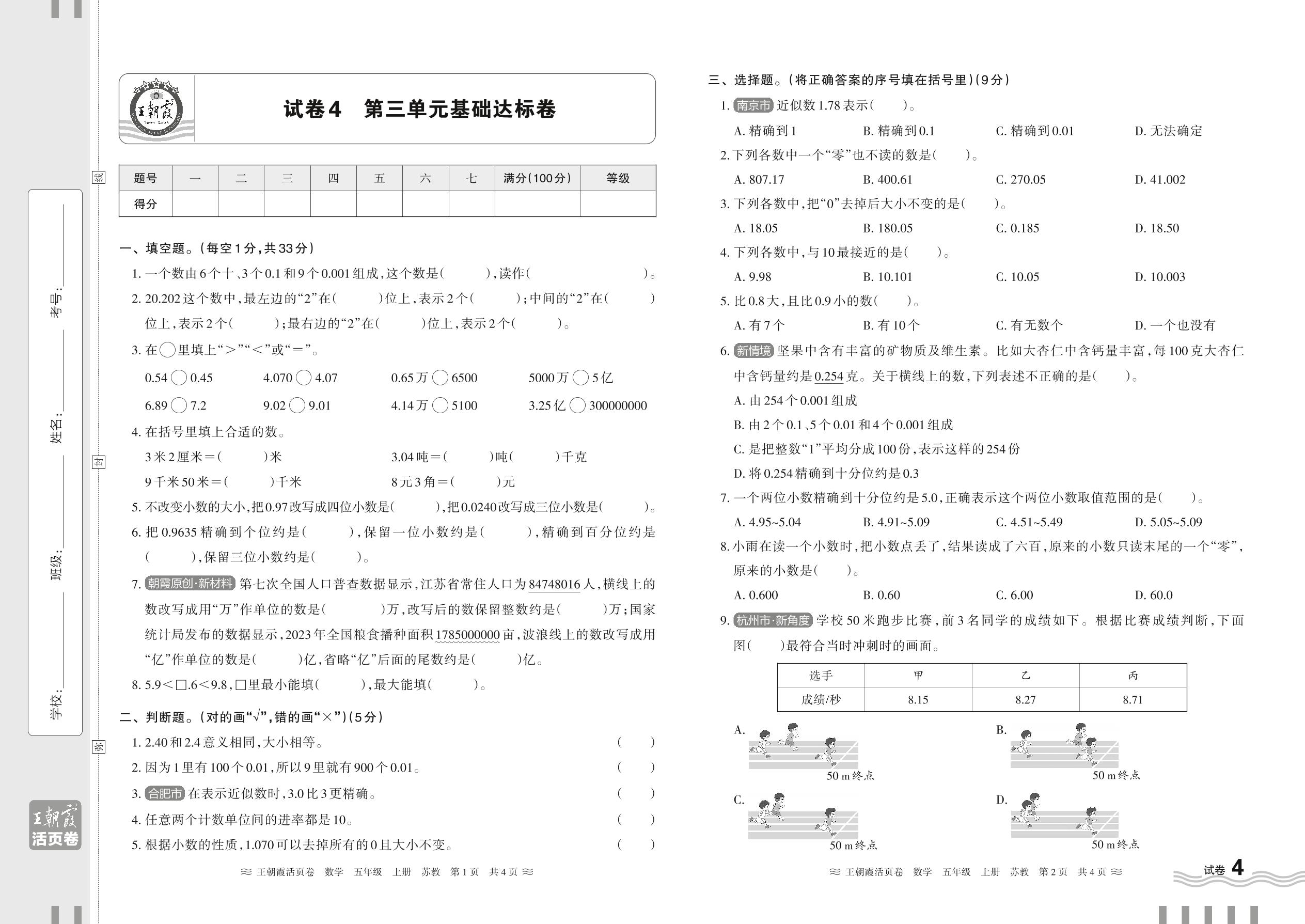 2024秋上册五年级数学苏教版 第三单元基础达标卷【4】