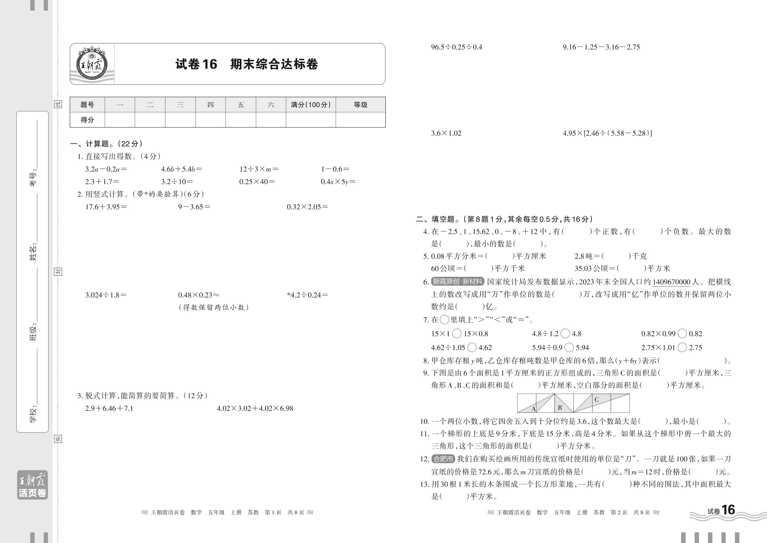 2024秋上册五年级数学苏教版 期末综合达标卷【16】