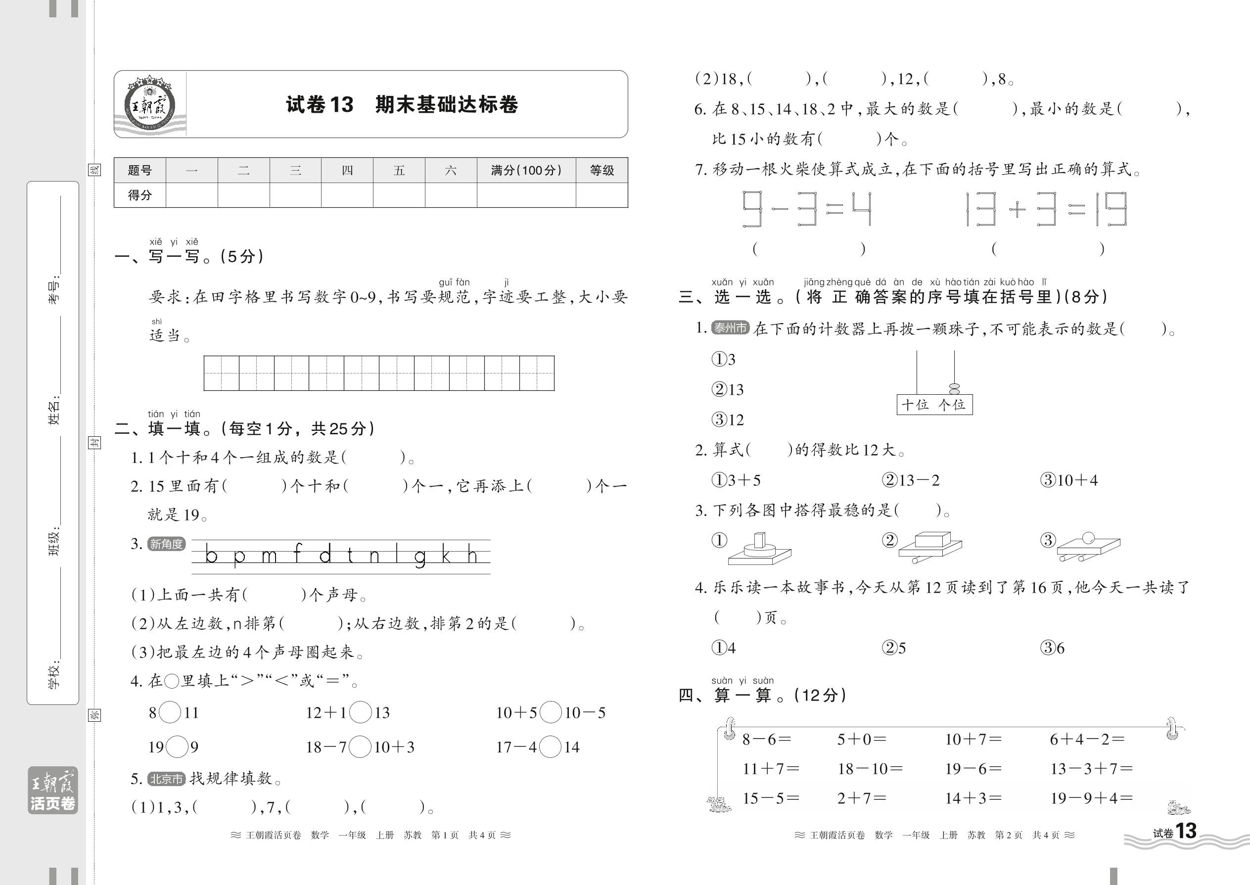 2024秋上册一年级数学苏教版(2024) 期末基础达标卷【13】