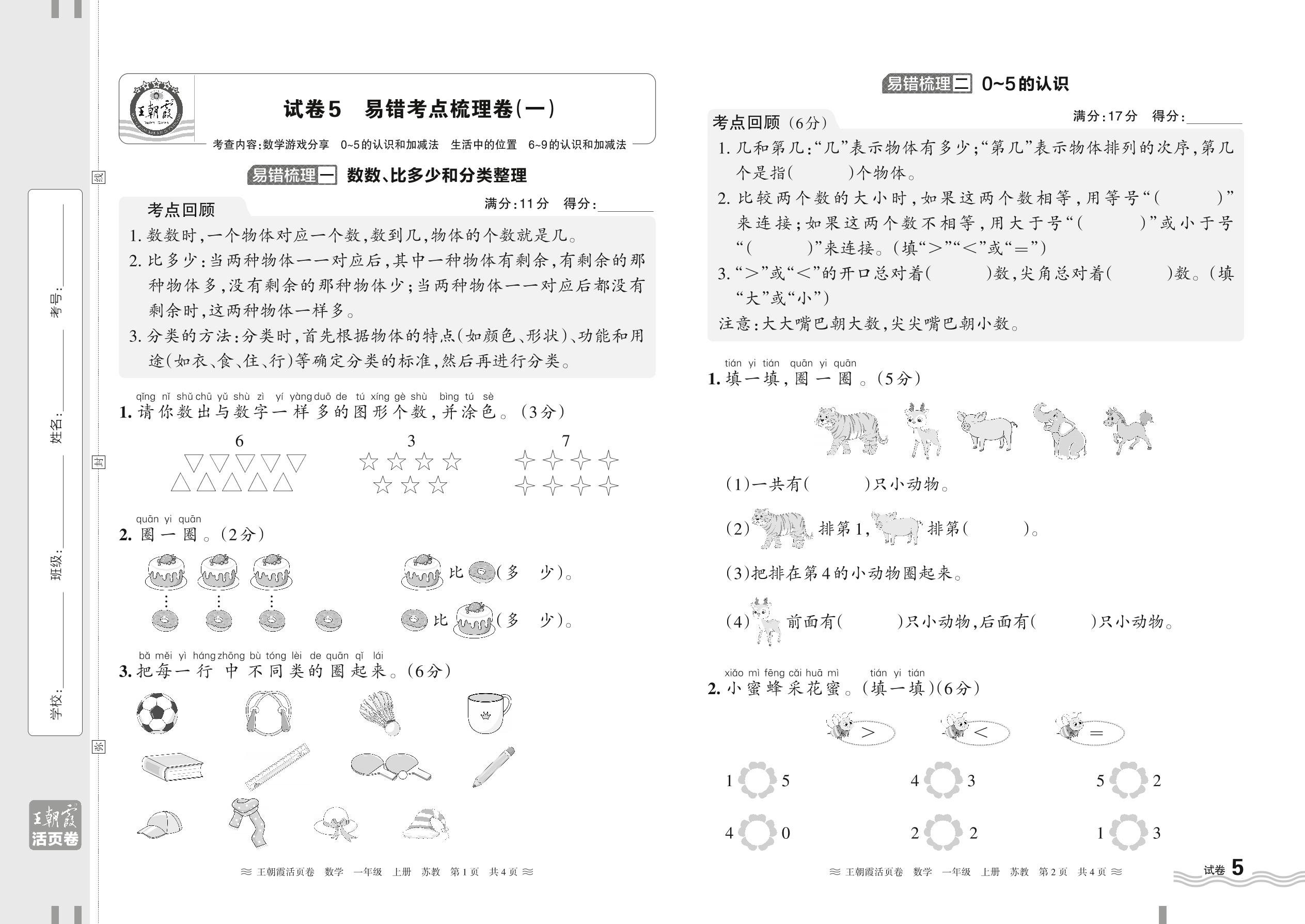 2024秋上册一年级数学苏教版(2024) 易错考点梳理卷:数学游戏分享、0~5的认识和加减法、生活中的位置、6~9的认识和加减法【5】
