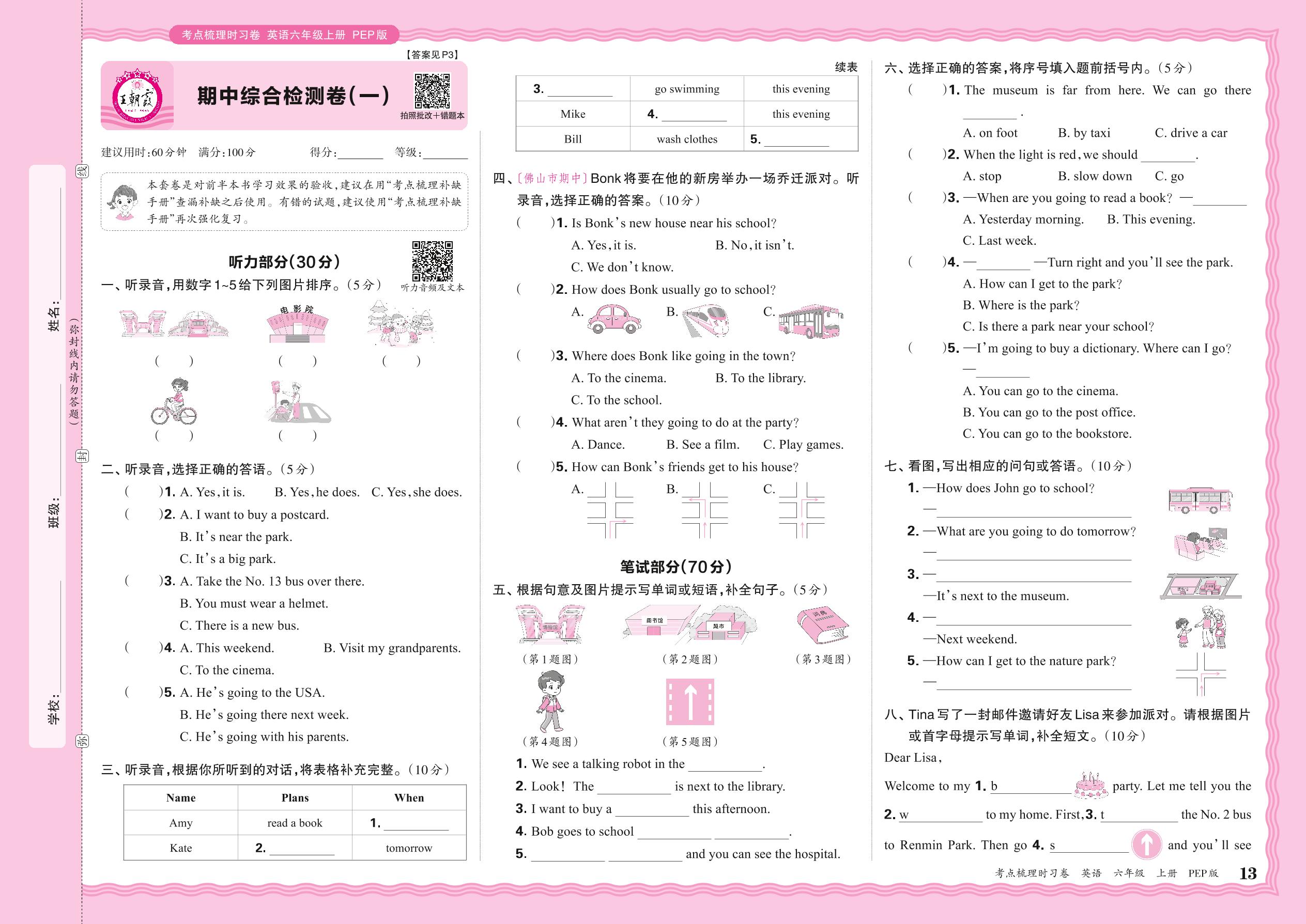 2024秋上册六年级英语人教PEP版(三起始) 期中综合检测卷(一)