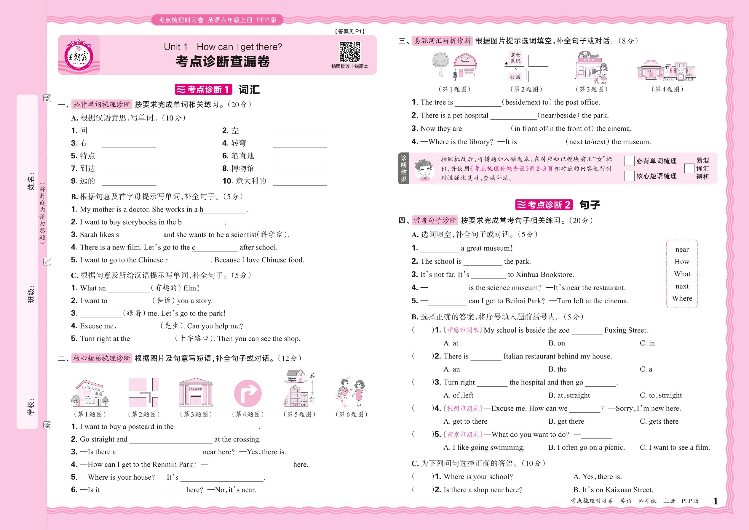 2024秋上册六年级英语人教PEP版(三起始) Unit 1 考点诊断查漏卷
