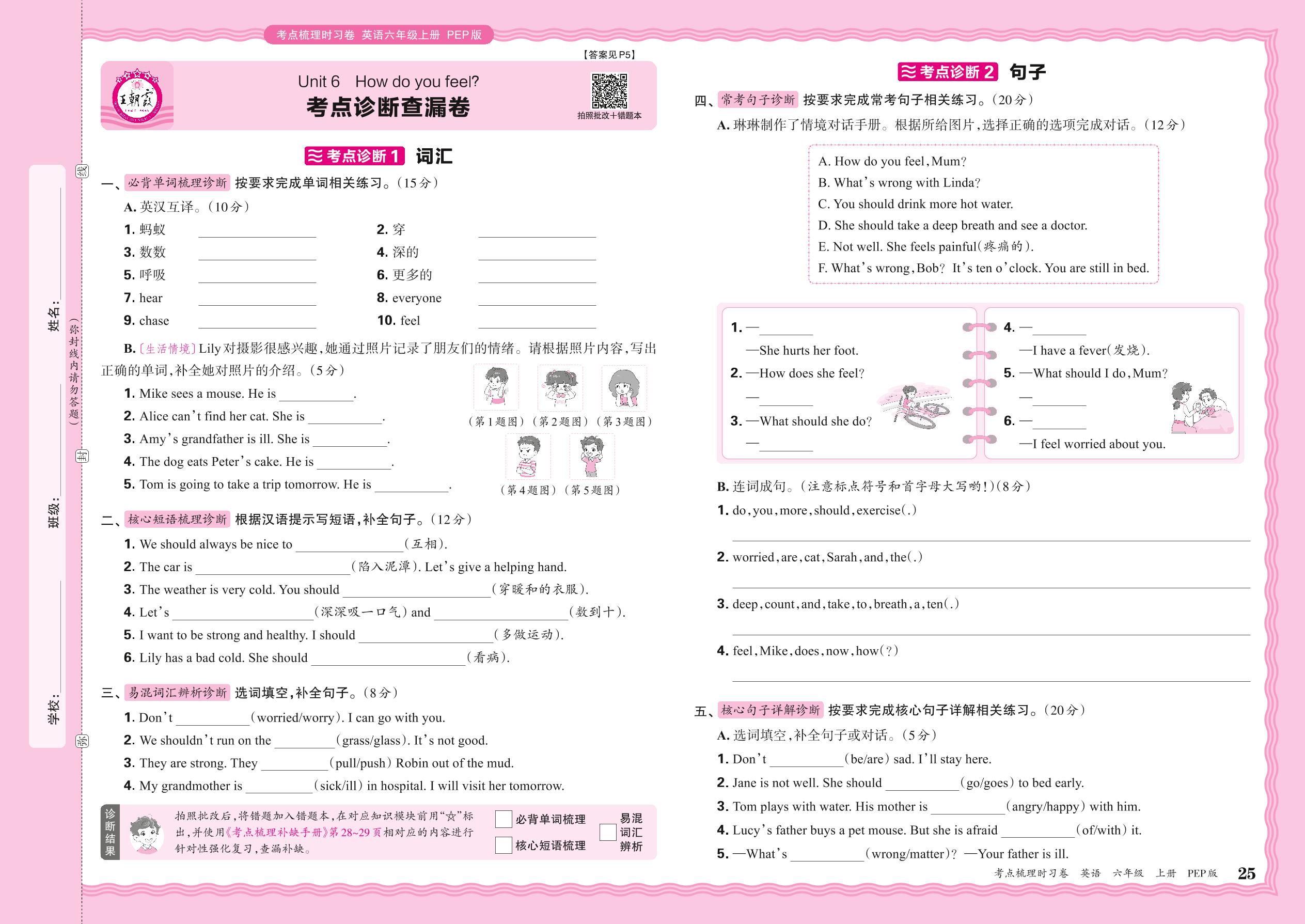 2024秋上册六年级英语人教PEP版(三起始) Unit 6 考点诊断查漏卷