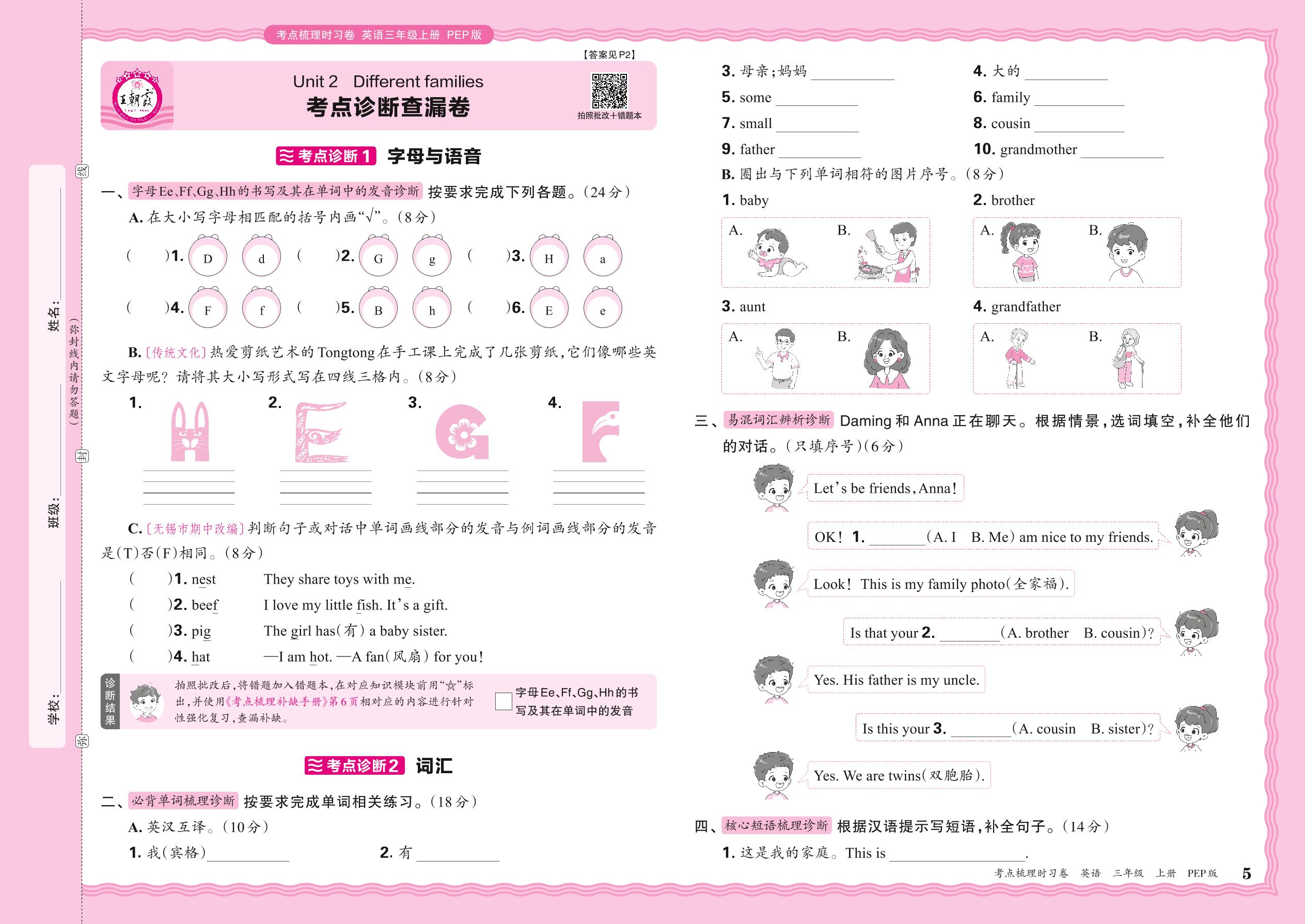 2024秋上册三年级英语人教PEP版(三起始) Unit 2 考点诊断查漏卷