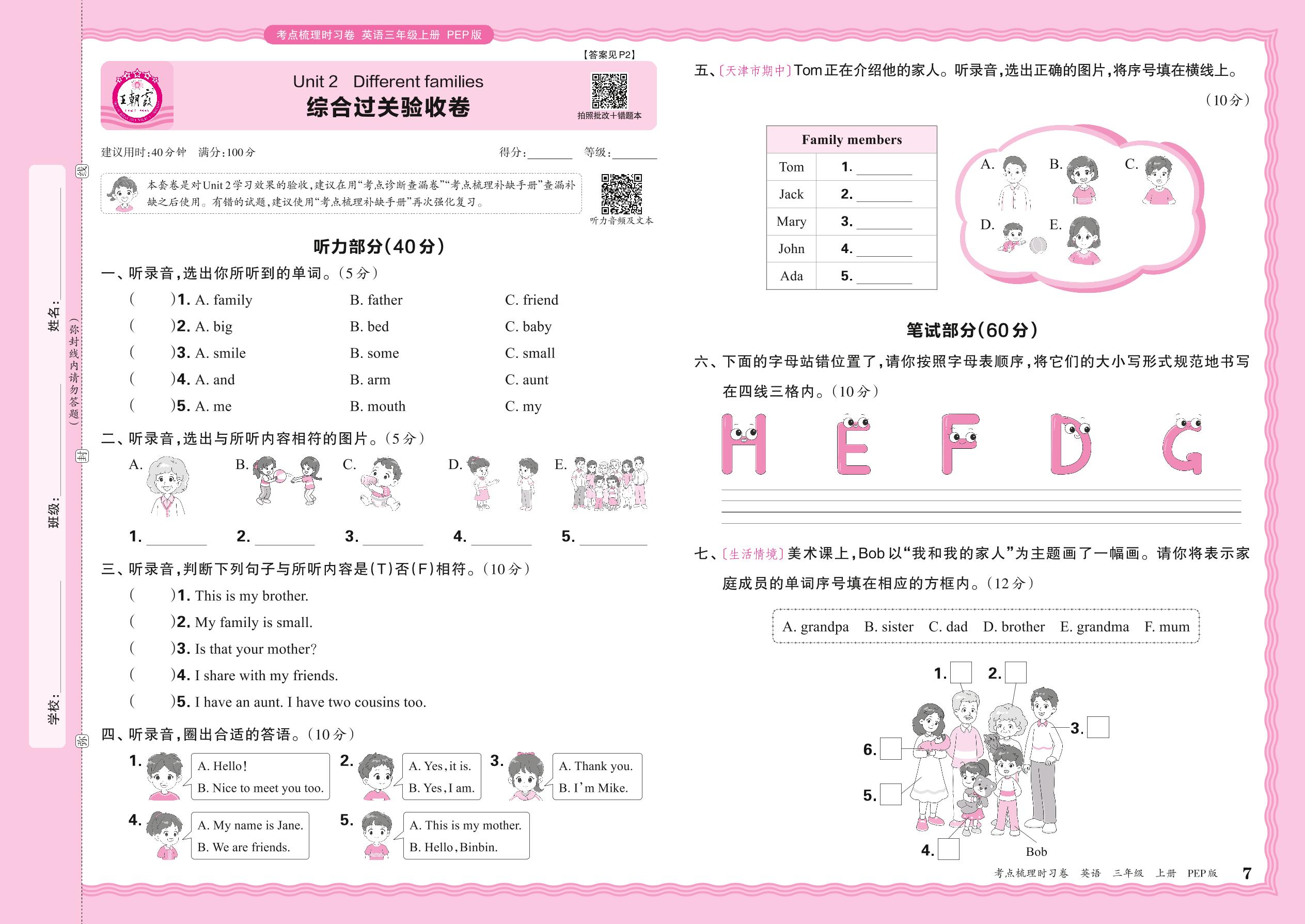 2024秋上册三年级英语人教PEP版(三起始) Unit 2 综合过关验收卷